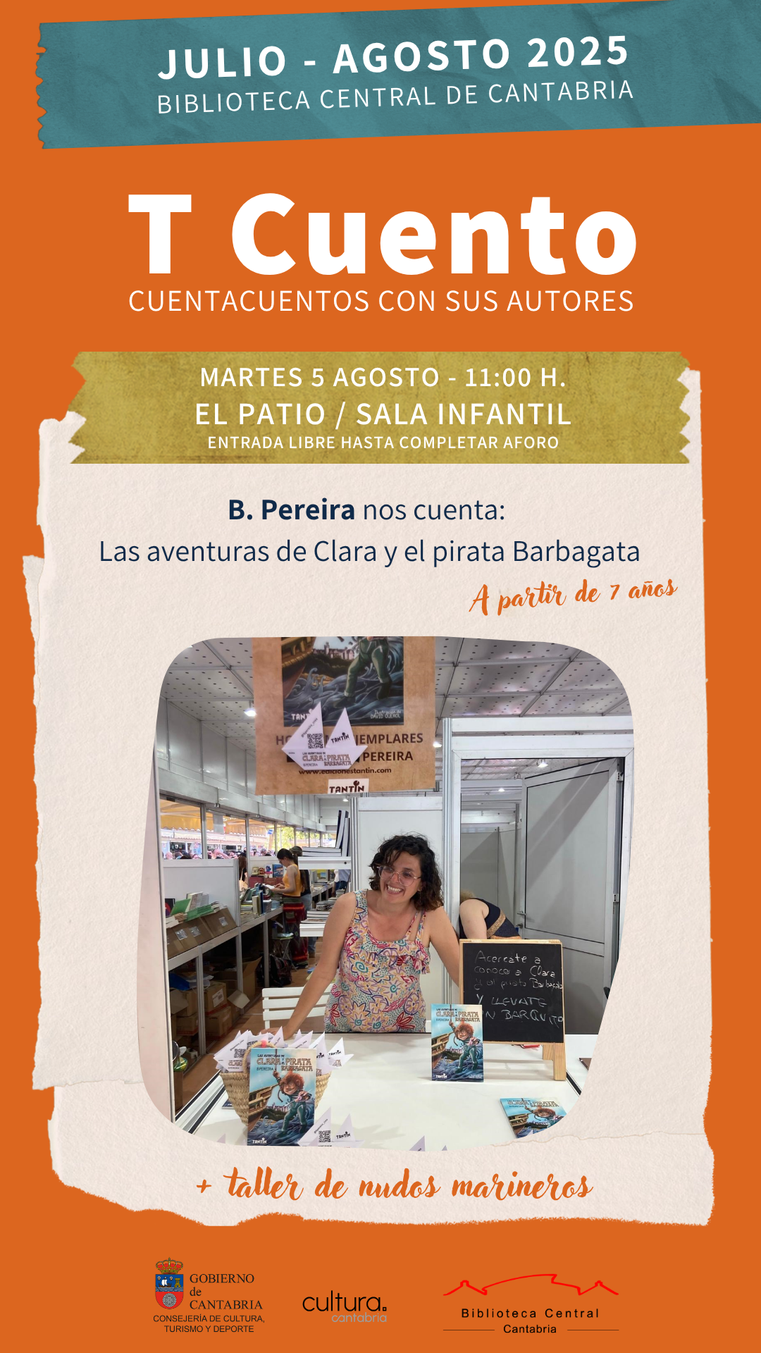 El martes 5 de agosto, B. Pereira nos cuenta “Las aventuras de Clara y el pirata Barbagata”. Cuentacuentos y taller para niñas y niños a partir de 7 años.