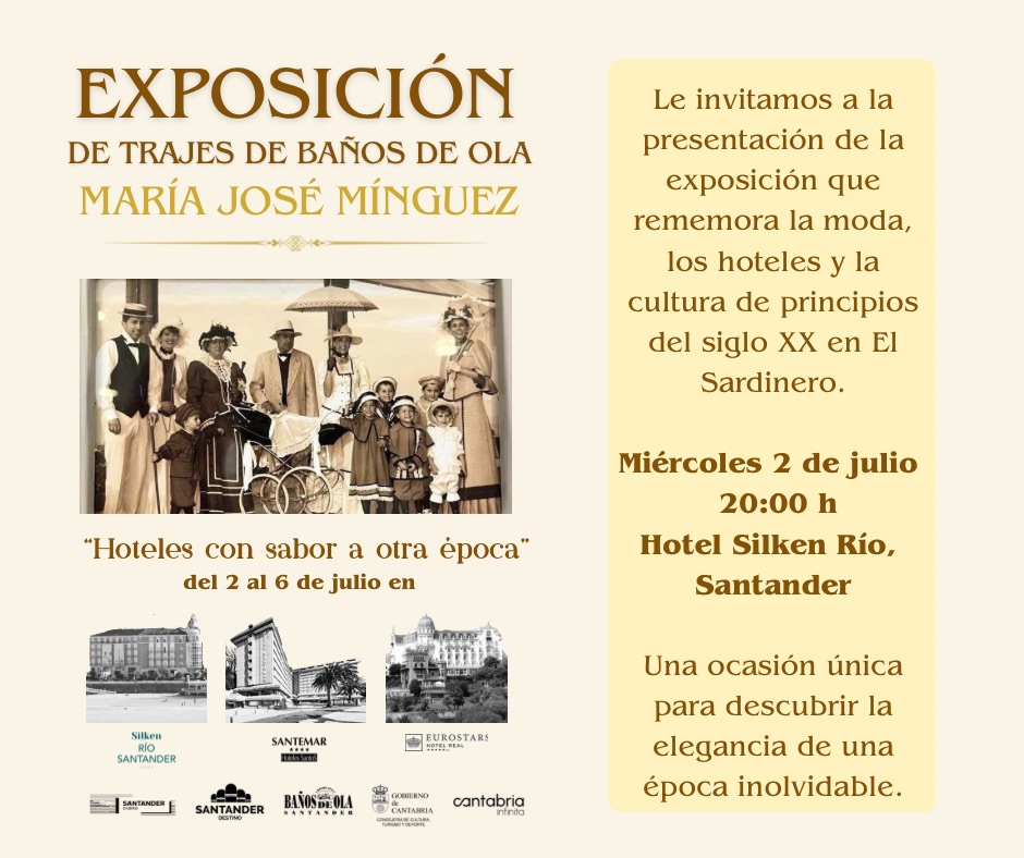 Con motivo de la tradicional celebración de los Baños de Ola, tres de los hoteles más emblemáticos del Sardinero acogerán, del 2 al 6 de julio, una exposición inédita de trajes de época de principios del siglo XX, diseñados por la modista y creadora cántabra María José Mínguez.