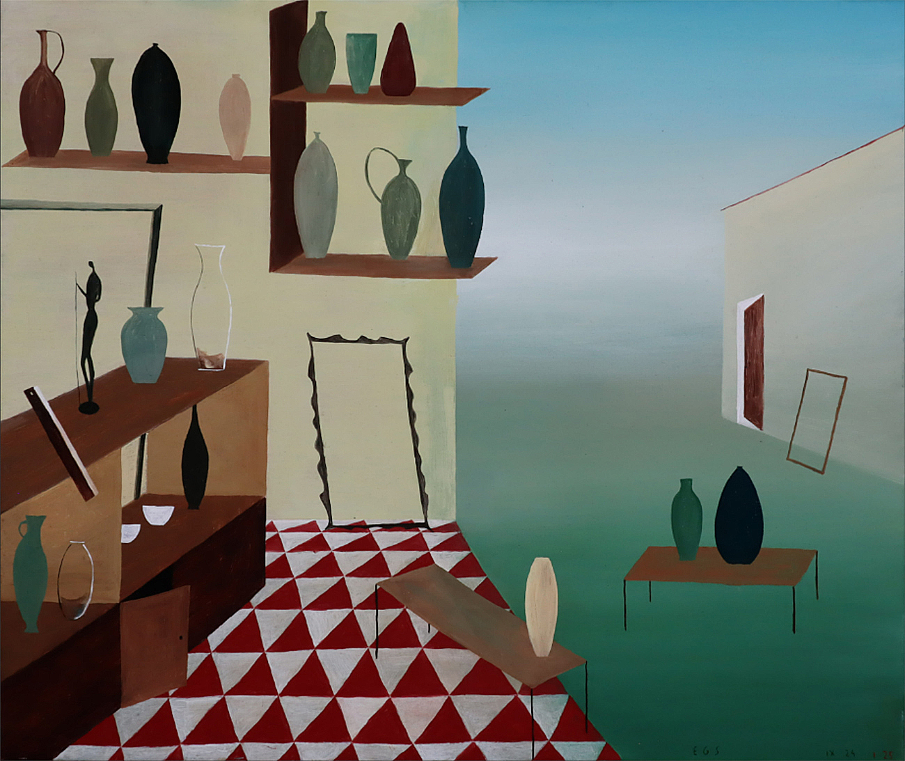 Estudios de artista, hasta cuatro versiones de “studiolos”, y varias pinturas sobre tabla enyesada, y una sorprendente obra titulada “12 vasijas”, que supone una novedad estructural que suma a los registros dobles, a la superposición de narraciones, -horizontales y verticales-, que ya ha incorporado a su lenguaje propio e identificable y que ha manteniendo de forma muy coherente a lo largo de los años, lo que le ha permitido formar parte de una exclusiva nómina de creadores que sin formar un grupo propiamente, constituyen algo que podían calificar como tendencia, por lo que de forma habitual hay obra suya en muestras de grupo de lo que podíamos llamar la nueva figuración española.
