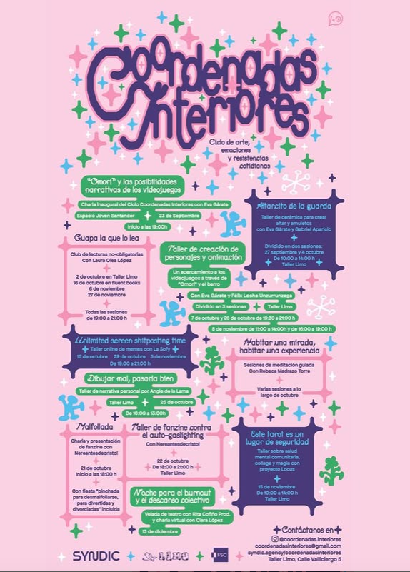 Coordenadas interiores es un proyecto multidisciplinar que explora cómo podemos ahondar en cuestiones de salud mental y el bienestar emocional a través del arte. A través de la colaboración con artistas locales y nacionales se ofrecerán talleres, charlas, teatro, clubes de lectura y meditaciones guiadas en Santander, creando espacios seguros para la reflexión, la conversación y la construcción de comunidad.
