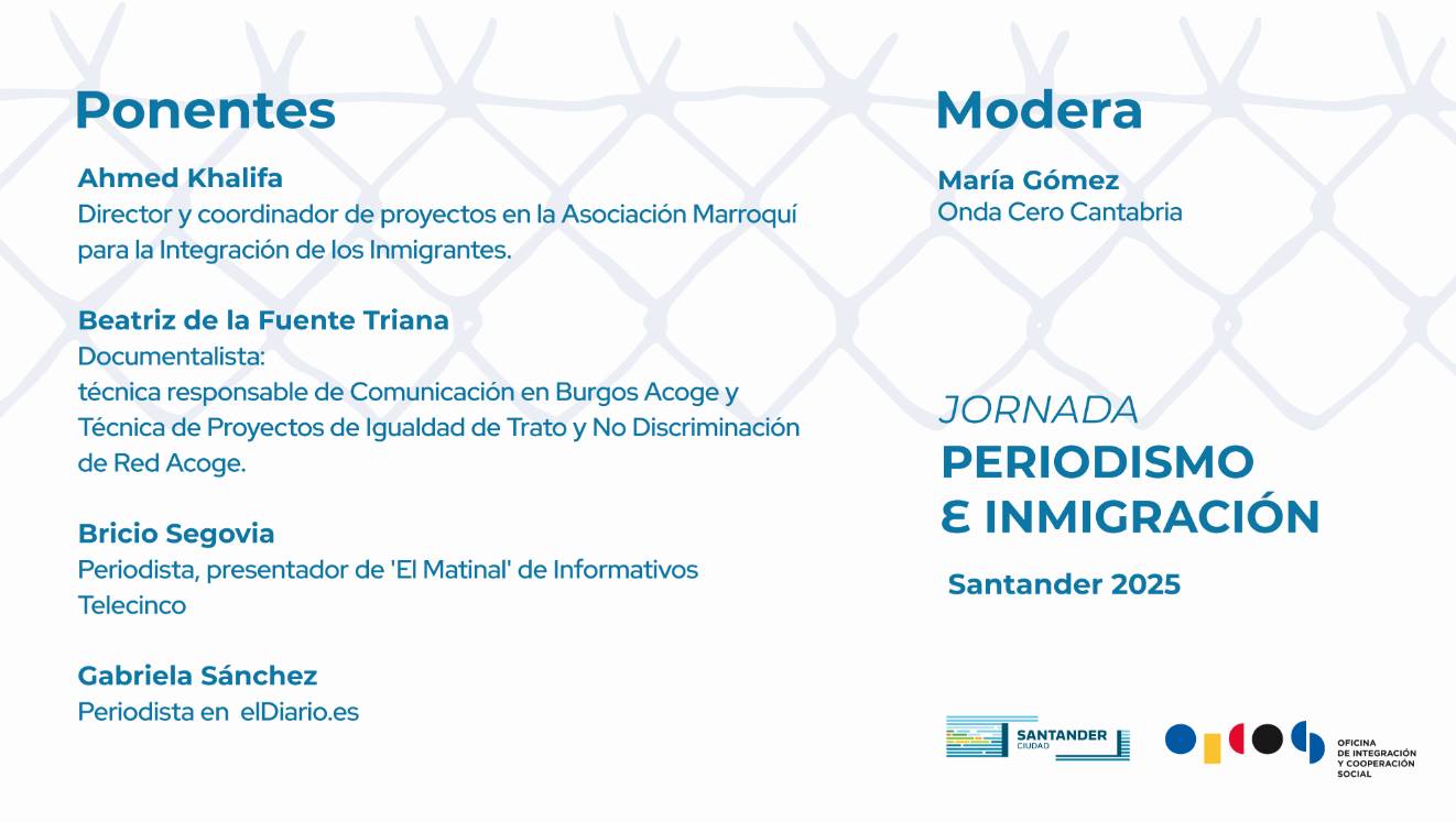 Participarán Ahmed Khalifa, licenciado en Derecho con especialización en Relaciones Internacionales; Beatriz de la Fuente Triana, documentalista y responsable de Comunicación en la Asociación Burgos Acoge; Bricio Segovia, periodista y presentador de 'El Matinal' de Informativos Telecinco; y Gabriela Sánchez, periodista en elDiario.es; Ahmed Khalifa, fundador y actual director y coordinador de proyectos en la Asociación Marroquí para la Integración de los Inmigrantes, una de las ONG más activas en Andalucía y España. Todos ellos estarán moderados por María Gómez, de Onda Cero Cantabria.