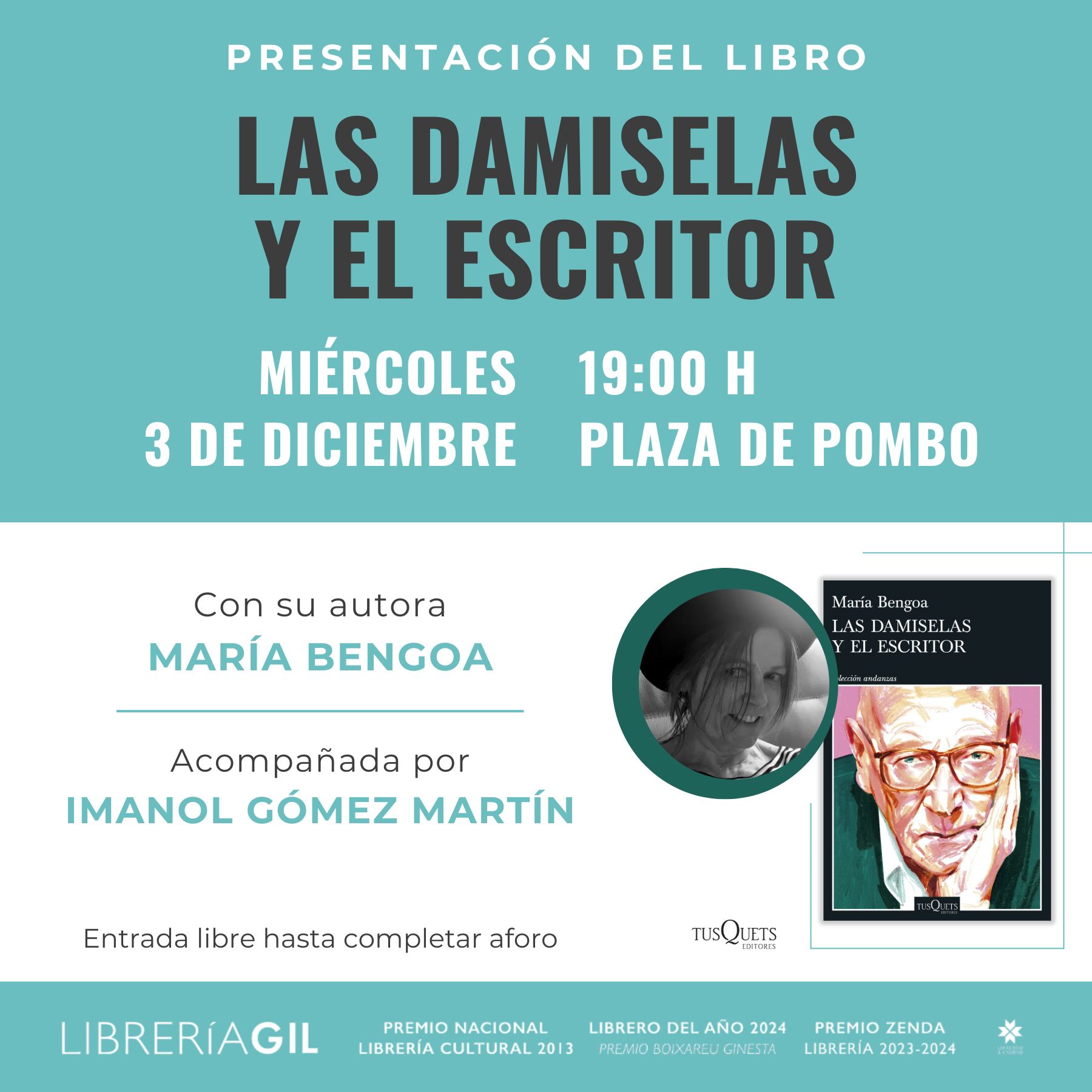 El miércoles, 3 de diciembre, a las 19:00 h. tendrá lugar la presentación de “Las damiselas y el escritor”, de María Bengoa. La autora estará acompañada por Imanol Gómez Martín. (Tusquets editores).