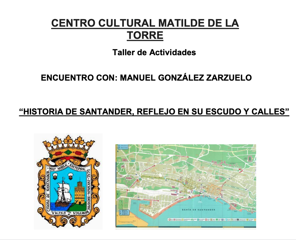 El miércoles 3 de diciembre de 2025, a las 18:00 horas, en el “Taller de Actividades” del Centro Cultural Matilde de la Torre, tendrá lugar el encuentro con Manuel González Zarzuelo, quien hablará a los asistentes sobre “Historia de Santander, reflejo en su escudo y calles”.