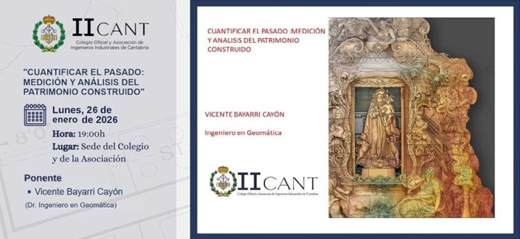 El lunes 26 de enero a las 19:00 h en el Colegio de Ingenieros Industriales (c/ Hernán Cortés nº 49) tendrá lugar la conferencia "Cuantificar el pasado. Medición y análisis del patrimonio construido" impartida por Vicente Bayarri Cayón, ingeniero en Geomática.