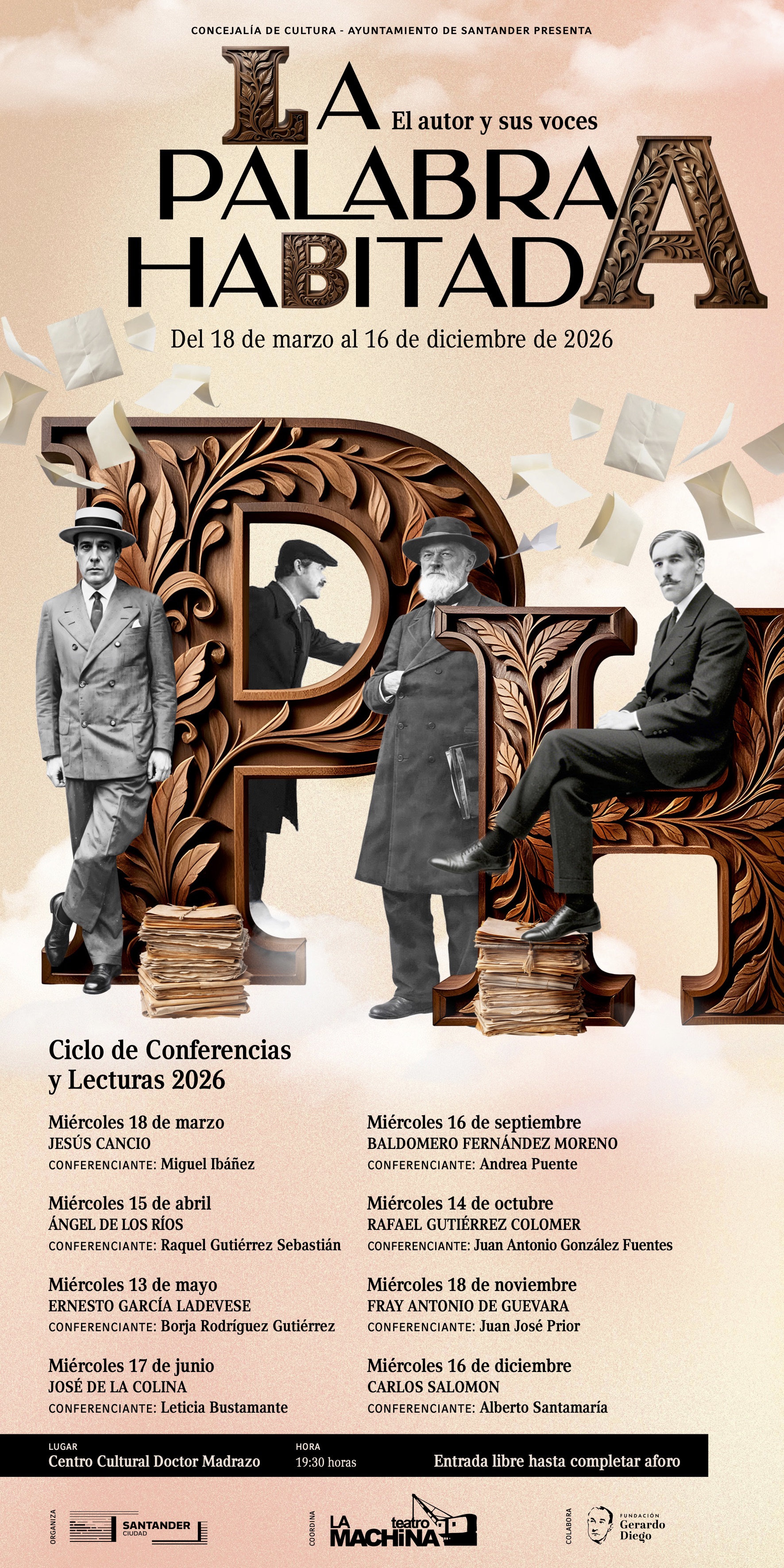 El ciclo “La Palabra Habitada. El autor y sus voces”, coordinado por La Machina Teatro y subvencionado por la Concejalía de Cultura del Ayuntamiento de Santander y, en una sesión, por la Fundación Gerardo Diego, ha programado para el año 2026, ocho conferencias en torno a escritores de Cantabria o vinculados a nuestra comunidad. El formato de cada una de las intervenciones girará en torno a una ponencia impartida por un profesor o investigador, acompañada de la lectura dramatizada, por parte de actrices y actores profesionales de La Machina Teatro, de algunos de los textos más significativos de los autores seleccionados.