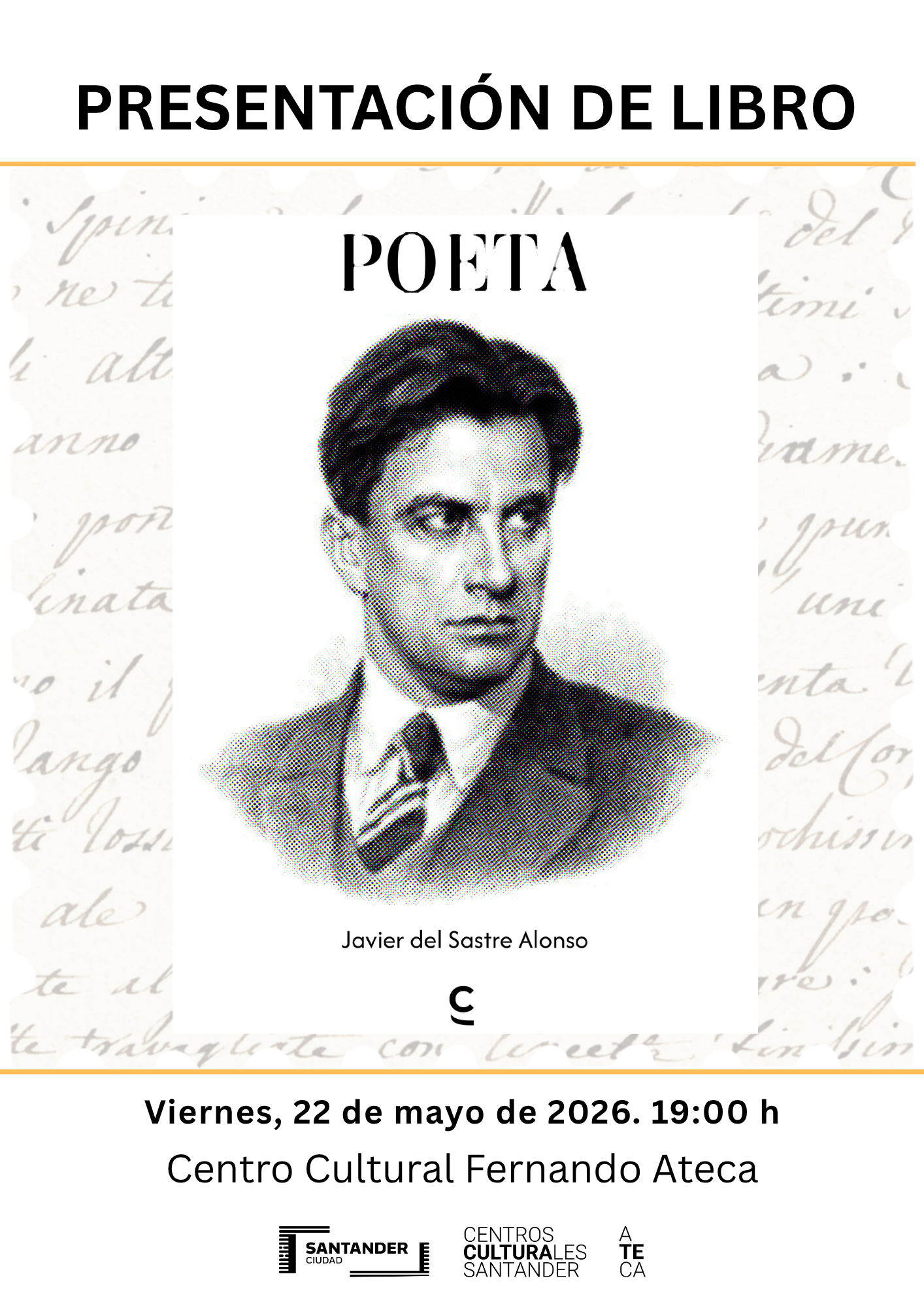 El viernes 22 de mayo, a las 19:00 h, el centro cultural Fernando Ateca acoge la presentación del libro “Poeta”, de Javier del Sastre. La entrada será libre hasta completar el aforo.