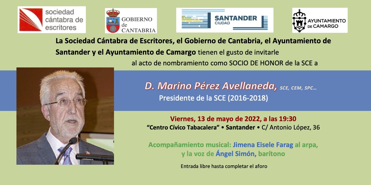 El día 13 de mayo, viernes, a las 19.30 h, tendrá lugar en el Centro Cívico Tabacalera de Santander el nombramiento como Socio de honor de la SCE (Sociedad Cántabra de Escritores) de Marino Pérez Avellaneda, presidente de la entidad de 2016 a 2018.