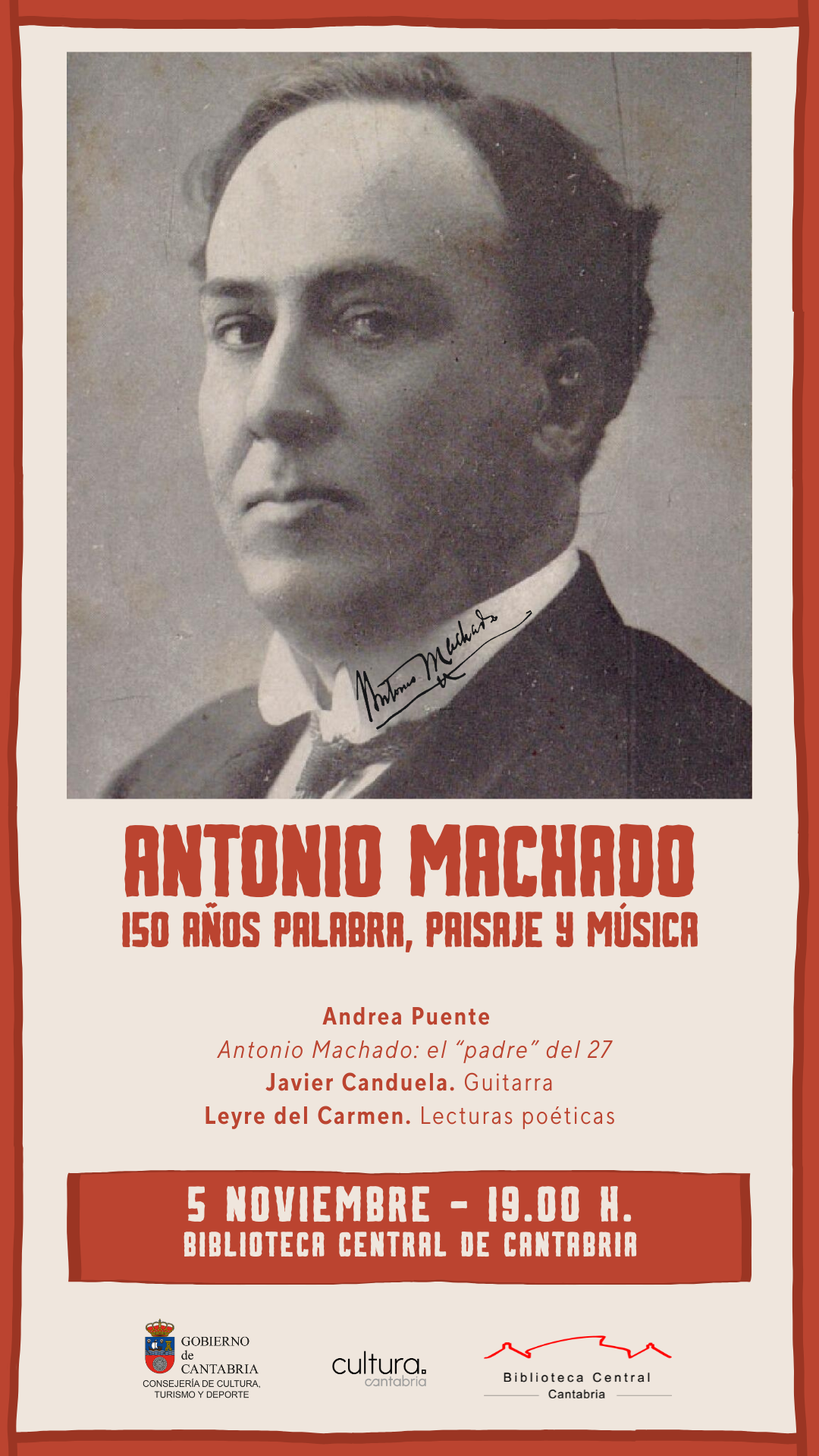 El acto comenzará con la ponencia de Andrea Puente, directora de la Fundación Gerardo Diego, “Antonio Machado: el “Padre” del 27”. El acompañamiento musical correrá a cargo del guitarrista y compositor Javier Canduela.