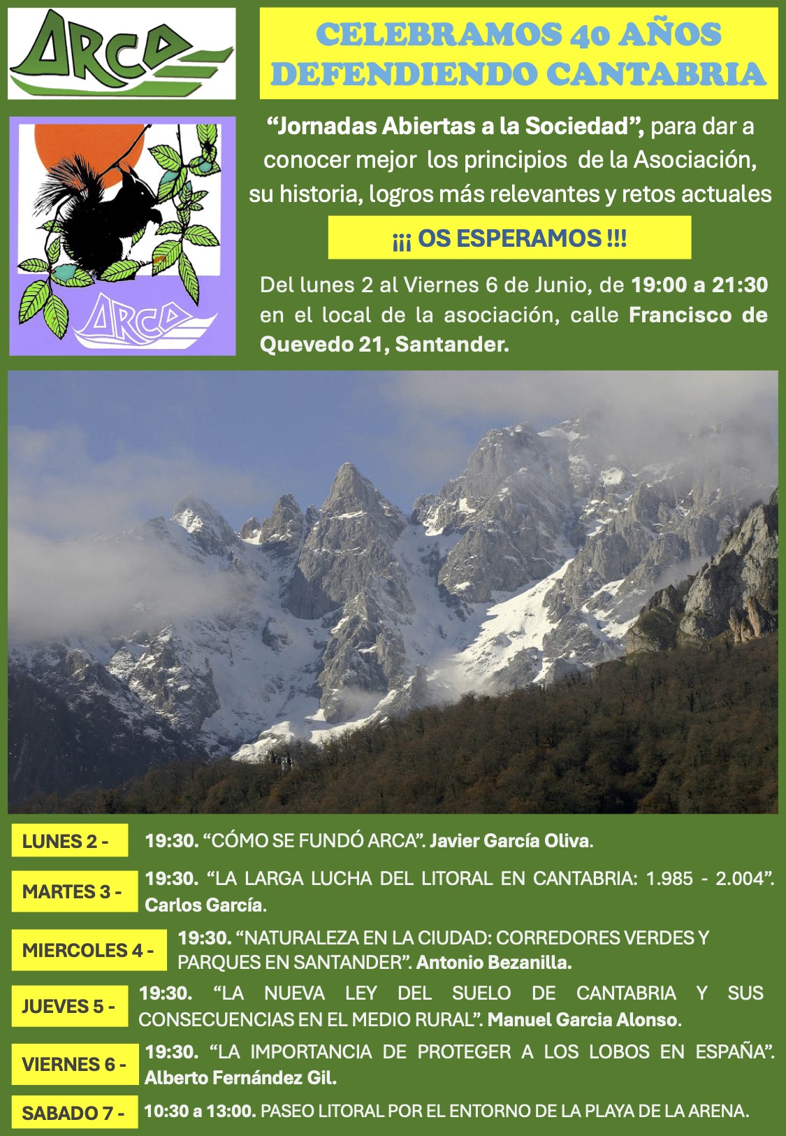 La Asociación para la Defensa de los Recursos Naturales de Cantabria, ARCA, tras cumplir 4 décadas defendiendo el territorio y medio natural de Cantabria, celebra unas Jornadas Abiertas a la Sociedad durante la semana del 2 al 6 de junio, dirigidas a la población en general, simpatizantes y socios, para dar a conocer mejor los principios de la Asociación, su historia, logros más relevantes y retos actuales.