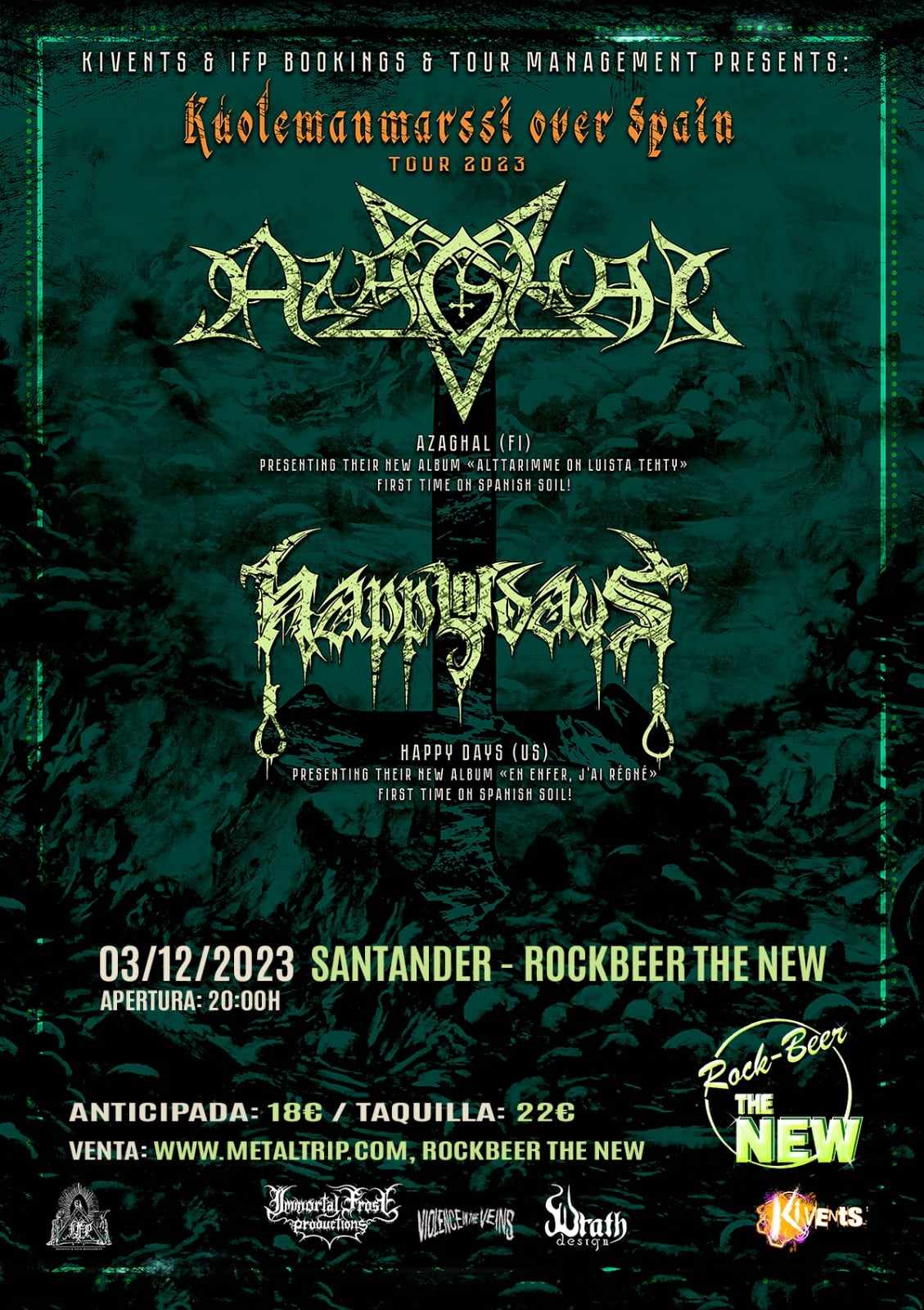 La gira española de Azaghal, “Kúolemanmarssi Over Spain Tour 2023”, que se extenderá durante el mes de diciembre de 2023, recalará en la sala Rock Beer the New de Santander. La legendaria banda de Black Metal finlandesa procedente de Hyvinkää y liderada por su guitarrista fundador Nargath estará presentando su nuevo álbum de estudio,“Alttarimme on Luista Tehty", publicado en febrero de 2023 por el sello Immortal Frost Productions.