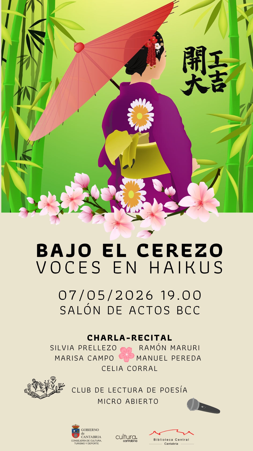 Posteriormente, participarán miembros del club de lectura de poesía de la BCC con una lectura de haikus creados para la ocasión o de autores conocidos. También habrá micro abierto para que participen asistentes al encuentro que deseen compartir algunos versos en esta velada.