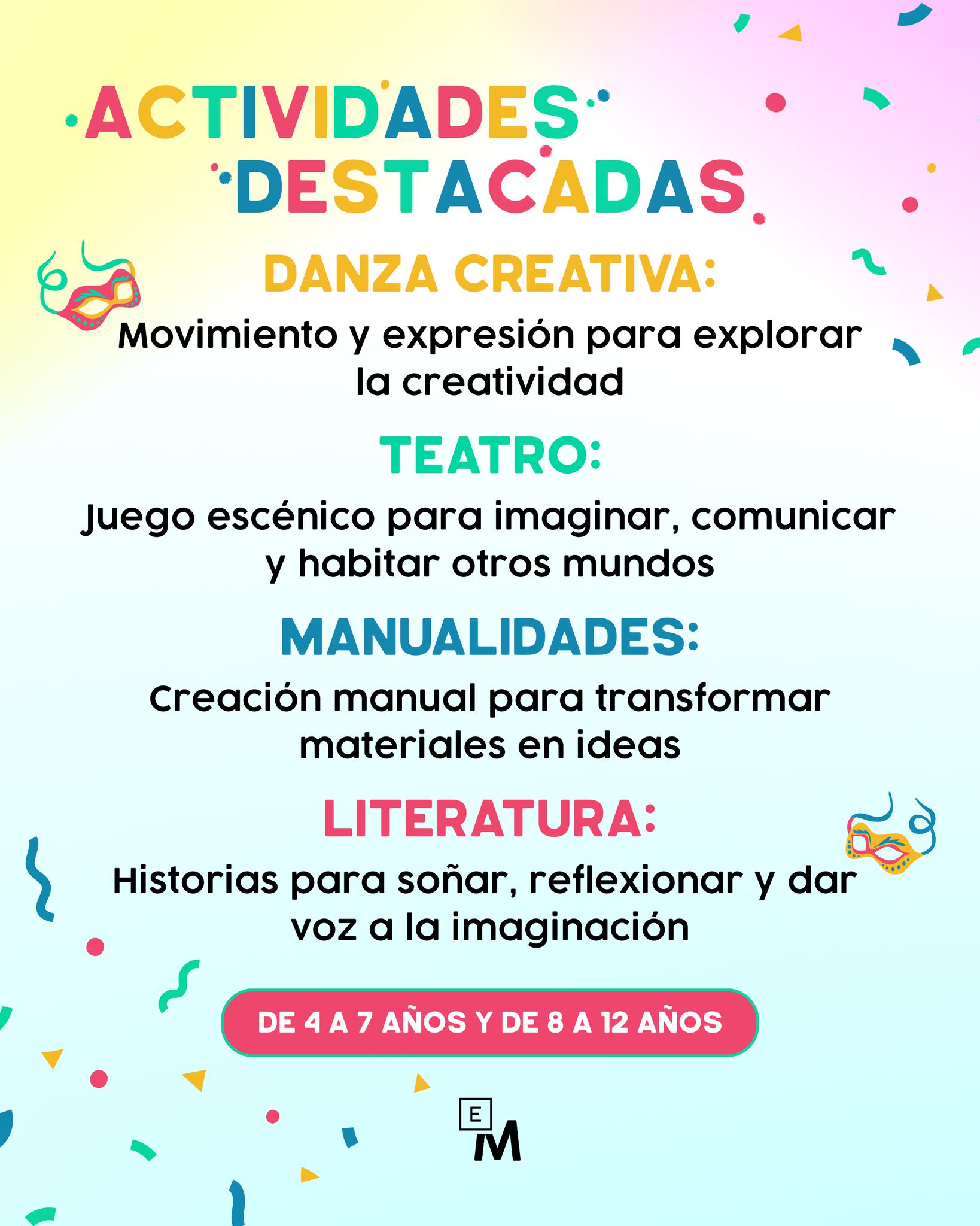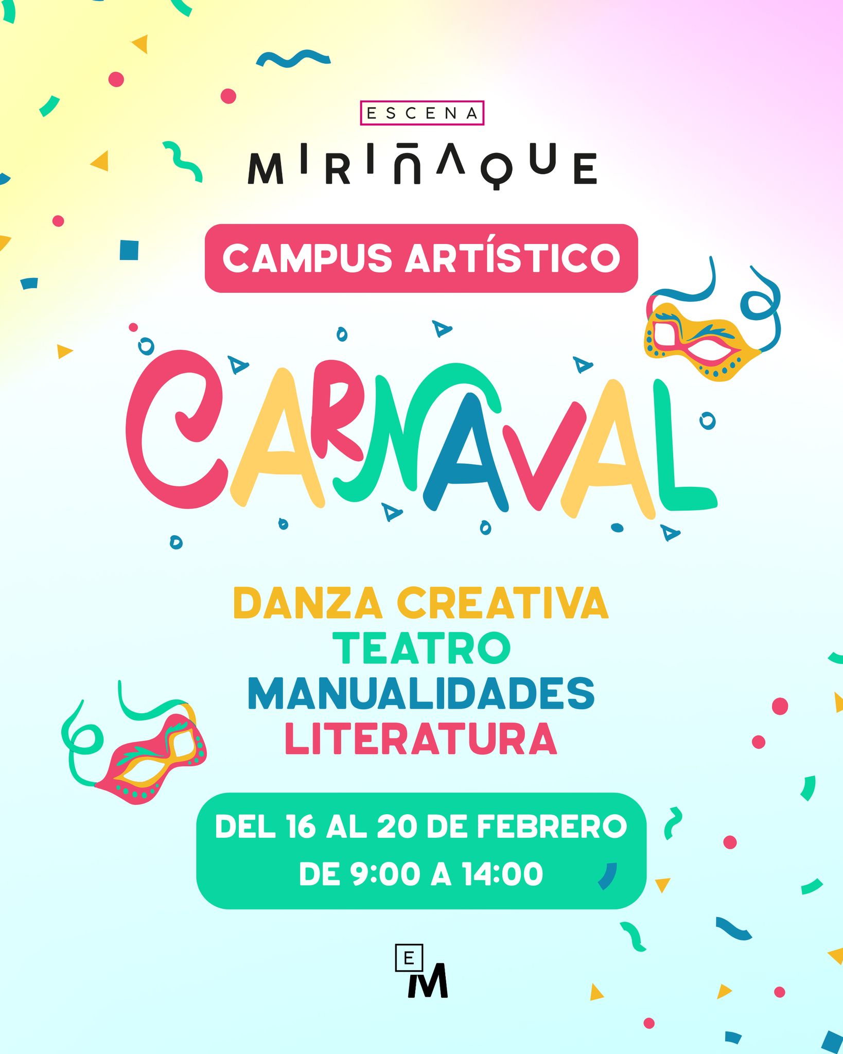 En este campus podrás encontrar actividades de danza creativa, teatro, manualidades y literatura, entre otras actividades, juegos y animaciones para que los niños y niñas vivan una experiencia divertida y llena de creatividad e imaginación en torno al Carnaval.