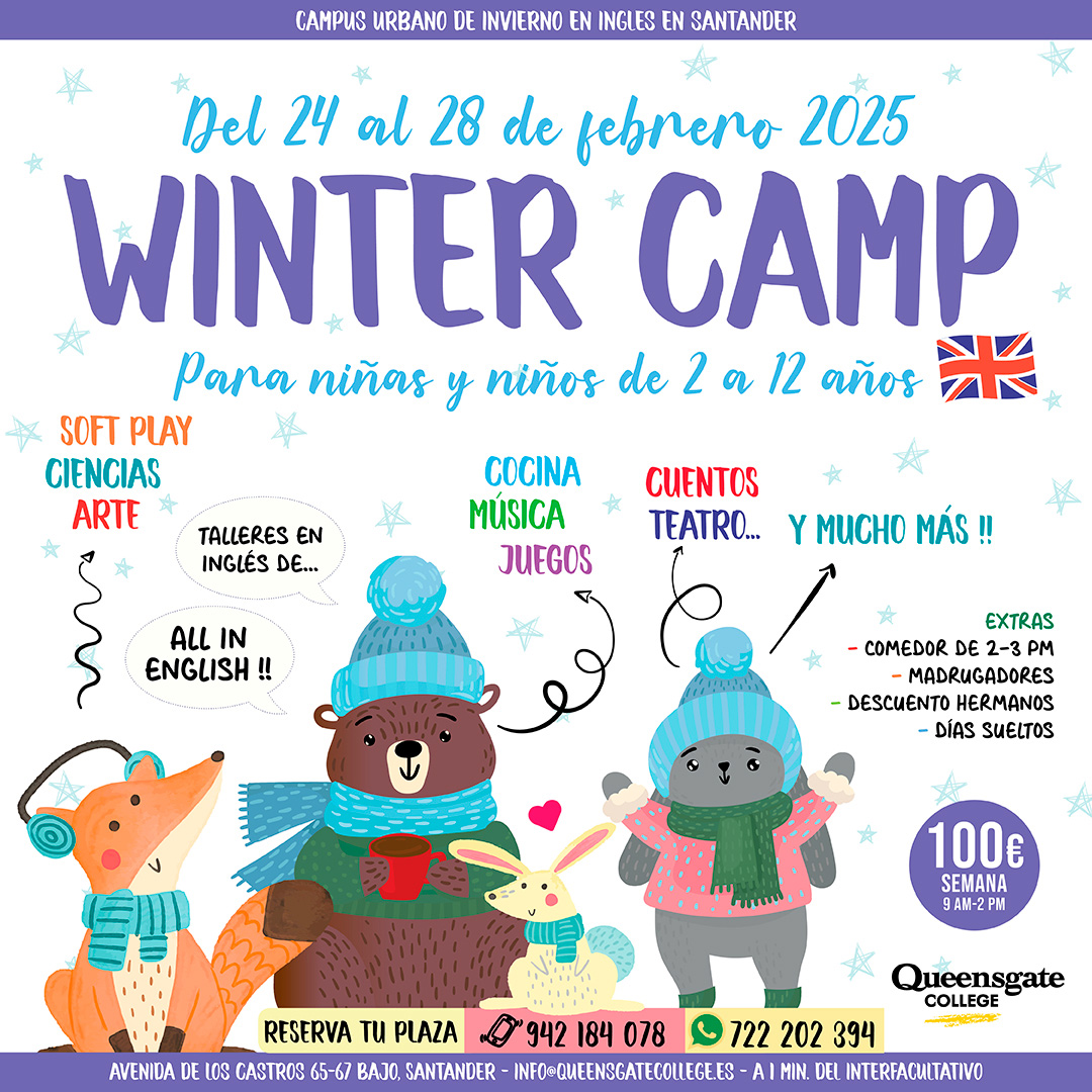 Nuevo campus urbano en inglés Winter Campus 2025, para niños y niñas de 2 a 12 años de edad, del 24 al 28 de febrero de 2025. Tienen preparadas muchas actividades: clases de cocina con recetas divertidas, talleres de arte y teatro, experimentos en ciencias y juegos, baila y canta en el taller de música y ¡¡salta!! en el taller de Soft Play.