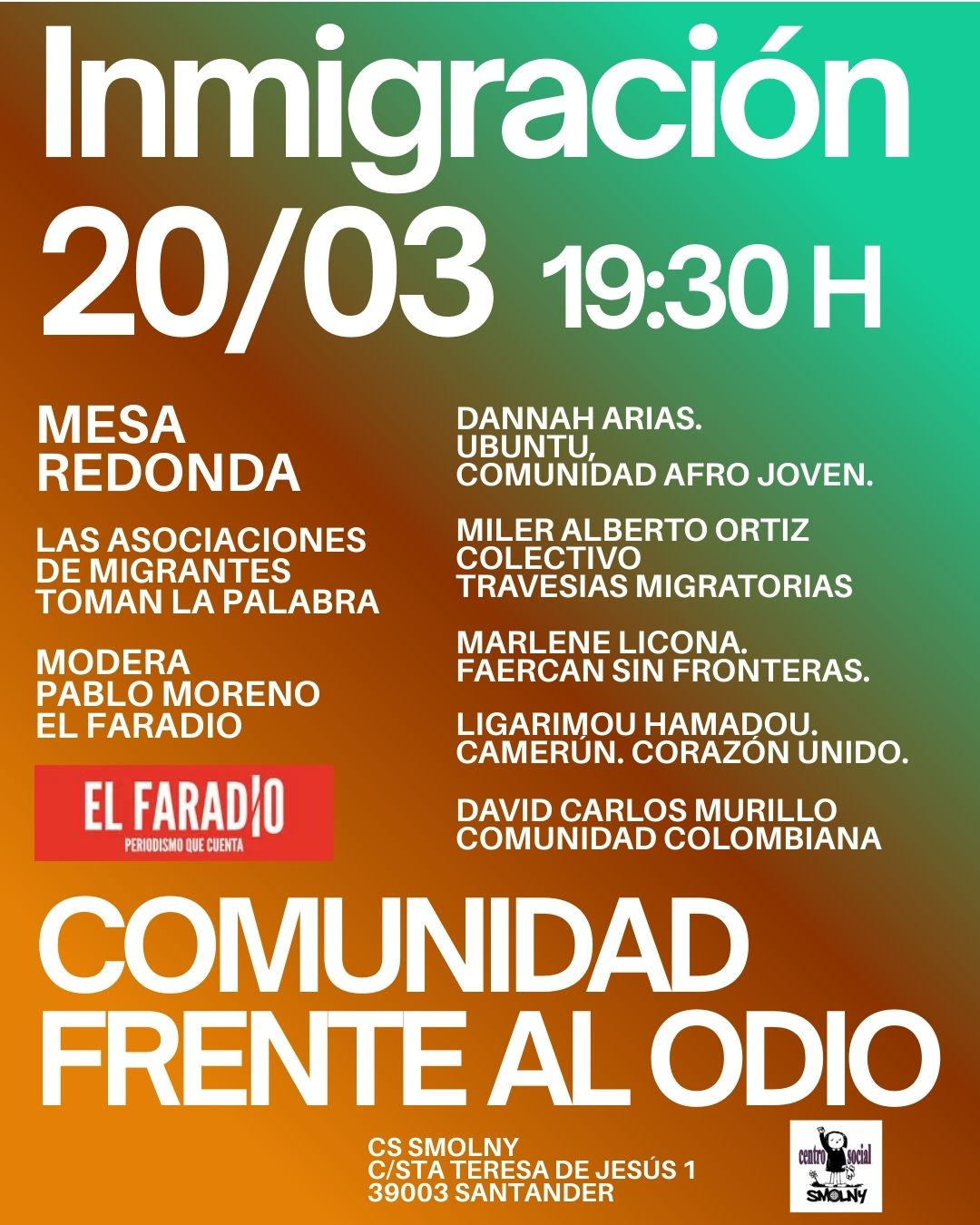El viernes 20 a las 19:30 horas se celebra una mesa redonda con diferentes colectivos de inmigrantes de Cantabria para ofrecer su visión sobre la situación actual de los inmigrantes en la región.