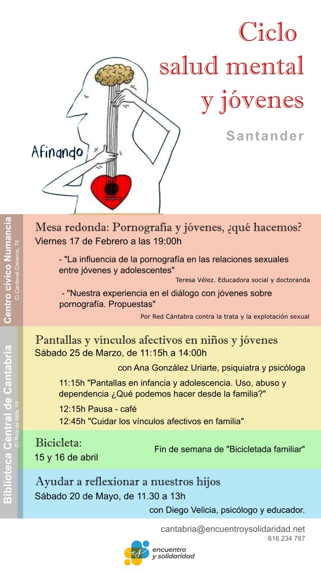De febrero a mayo, habrá una actividad mensual en la que madres y padres y profesionales relacionados con la infancia y juventud, puedan encontrarse y dialogar sobre diversas cuestiones que están detrás de este malestar emocional y psicológico. Algunos de los talleres podrán hacerse en familia, con niños y jóvenes.