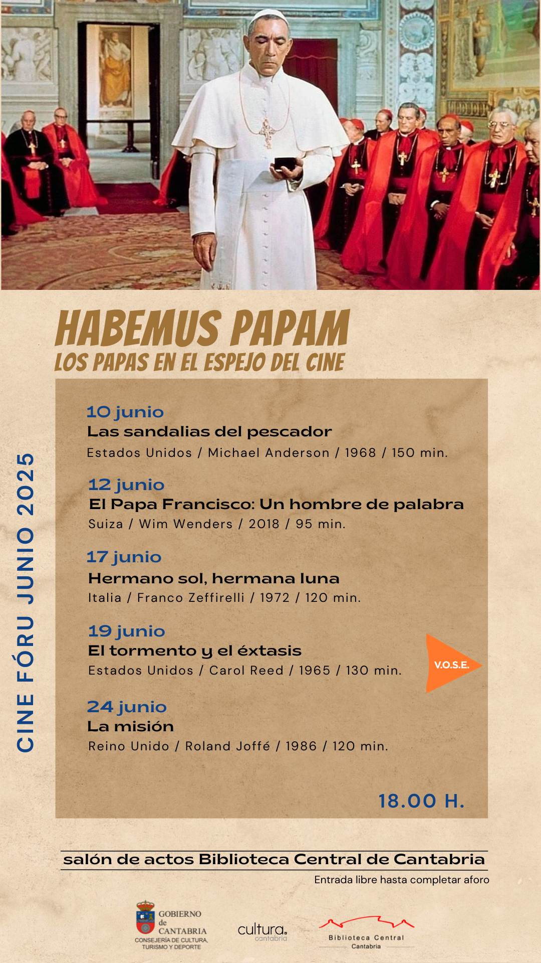 La Biblioteca Central de Cantabria programa en el mes de junio el ciclo de cinefórum “Habemus Papam. Los Papas en el espejo del cine”. El programa lo conforman cinco proyecciones que van desde largometrajes con argumentos que recrean, en mayor o menor medida, la vida de algunos destacados pontífices, algunos de ellos adaptaciones de obras literarias, hasta biopics o películas documentales basadas en figuras más recientes.