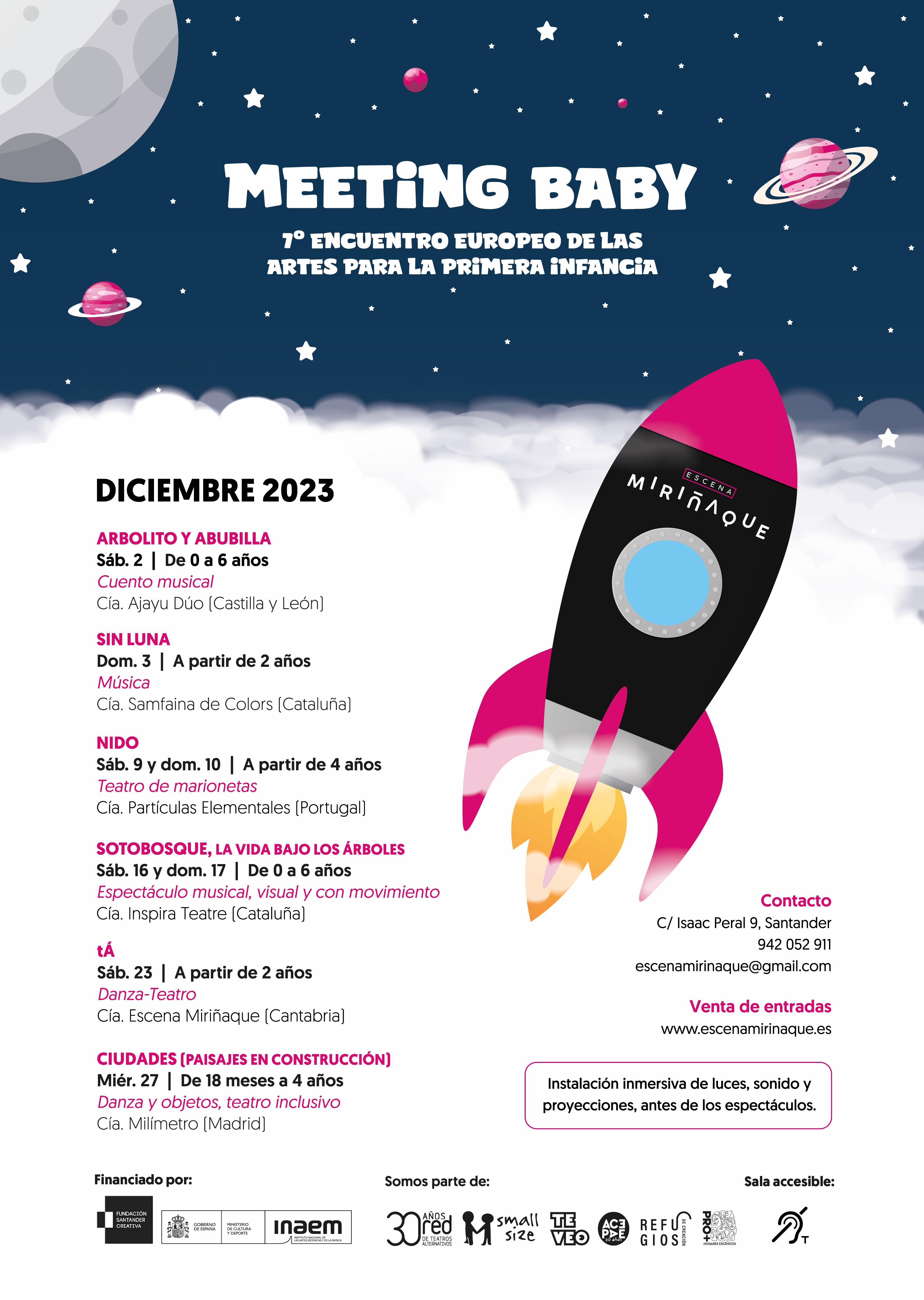 La séptima edición del Meeting Baby despliega una programación diseñada para espectadores de cero a seis años. Toma al bebé como espectador del presente y no del futuro, y reivindica su derecho a formar parte de aquellos procesos artísticos que pueden favorecer su inteligencia emocional y desarrollar sus habilidades.