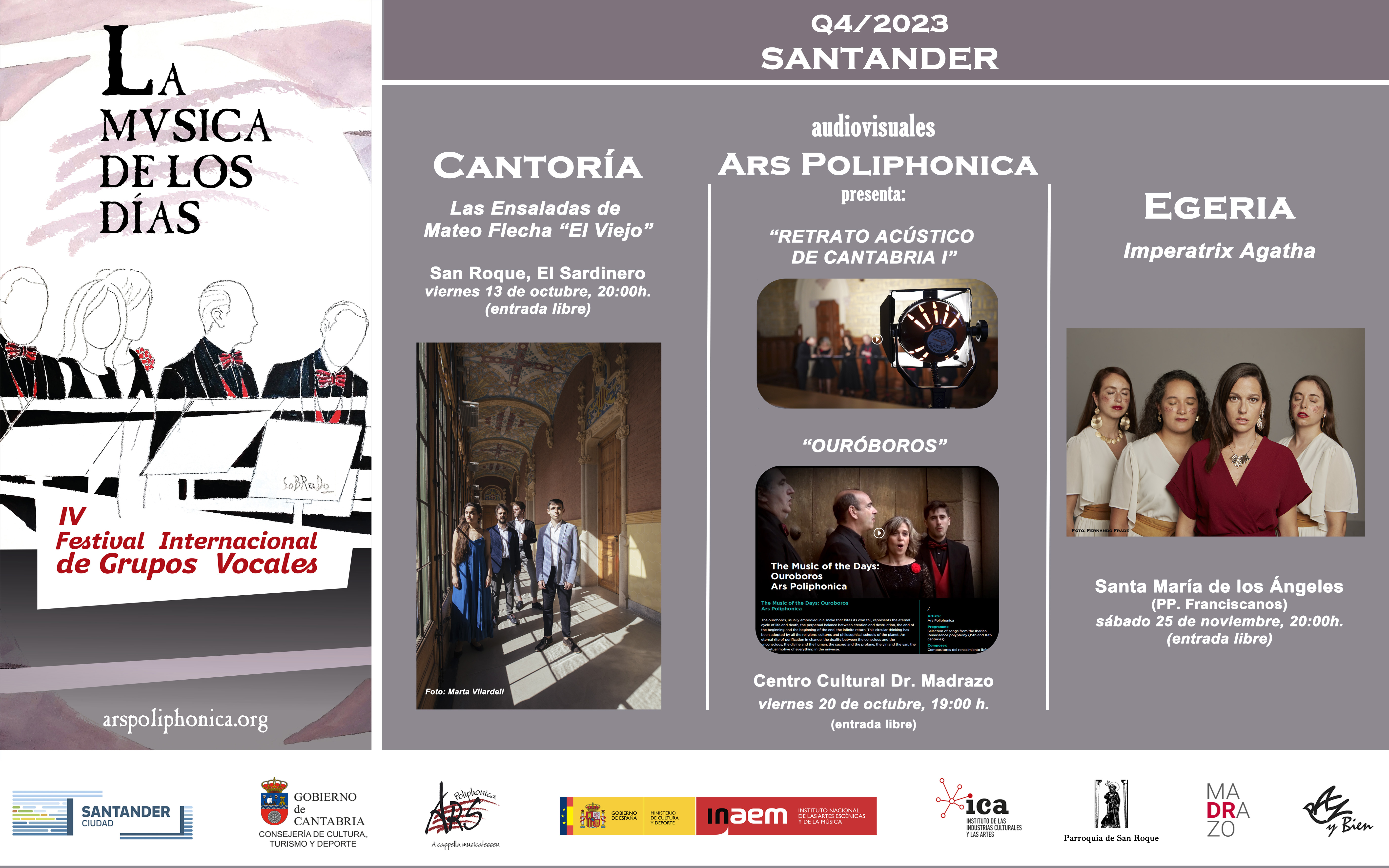 La Mvsica de los Días es un proyecto multidisciplinar y pedagógico centrado en las músicas históricas y con particular empeño en destacar la polifonía ibérica. Las próximas actividades programadas para este IV Festival en el último trimestre del año, con el patrocinio del Ayuntamiento de Santander, Ars Poliphonica y Gobierno de Cantabria, y la colaboración de las iglesias de San Roque y Santa María de los Ángeles, nos ofrecerán dos conciertos y dos proyecciones audiovisuales.