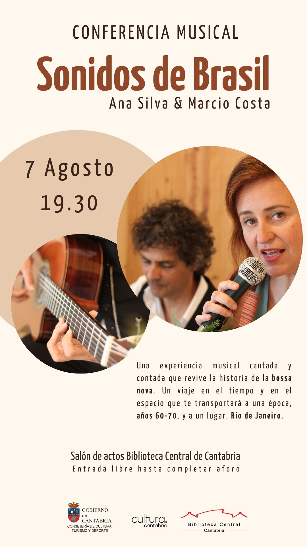 “Sonidos de Brasil” es una experiencia musical única que transportará a los asistentes a la vibrante Río de Janeiro de los años 60-70, la época dorada de la bossa nova y la samba. A través de un formato de guitarra y voz, se presenta un espectáculo íntimo y cautivador que combina música, narración e imágenes.