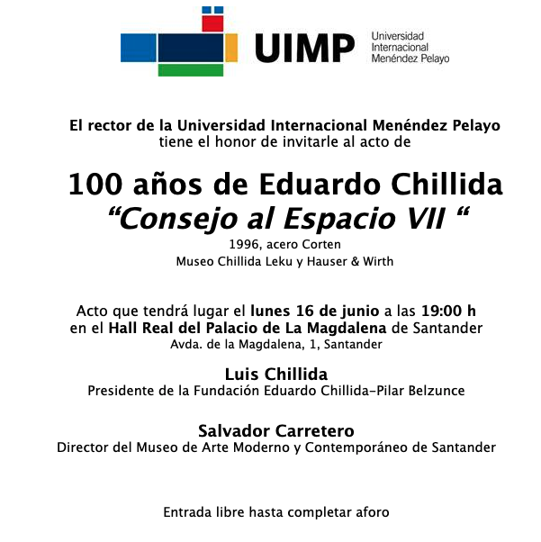 El acto de presentación bajo el título de "100 años de Eduardo Chillida" tuvo lugar el lunes 16 de junio a las 19:00 h en el Hall Real del Palacio de La Magdalena con la participación de Luis Chillida, Presidente de la Fundación Eduardo Chillida-Pilar Belzunce y Salvador Carretero, director del Museo de Arte Moderno y Contemporáneo de Santander.