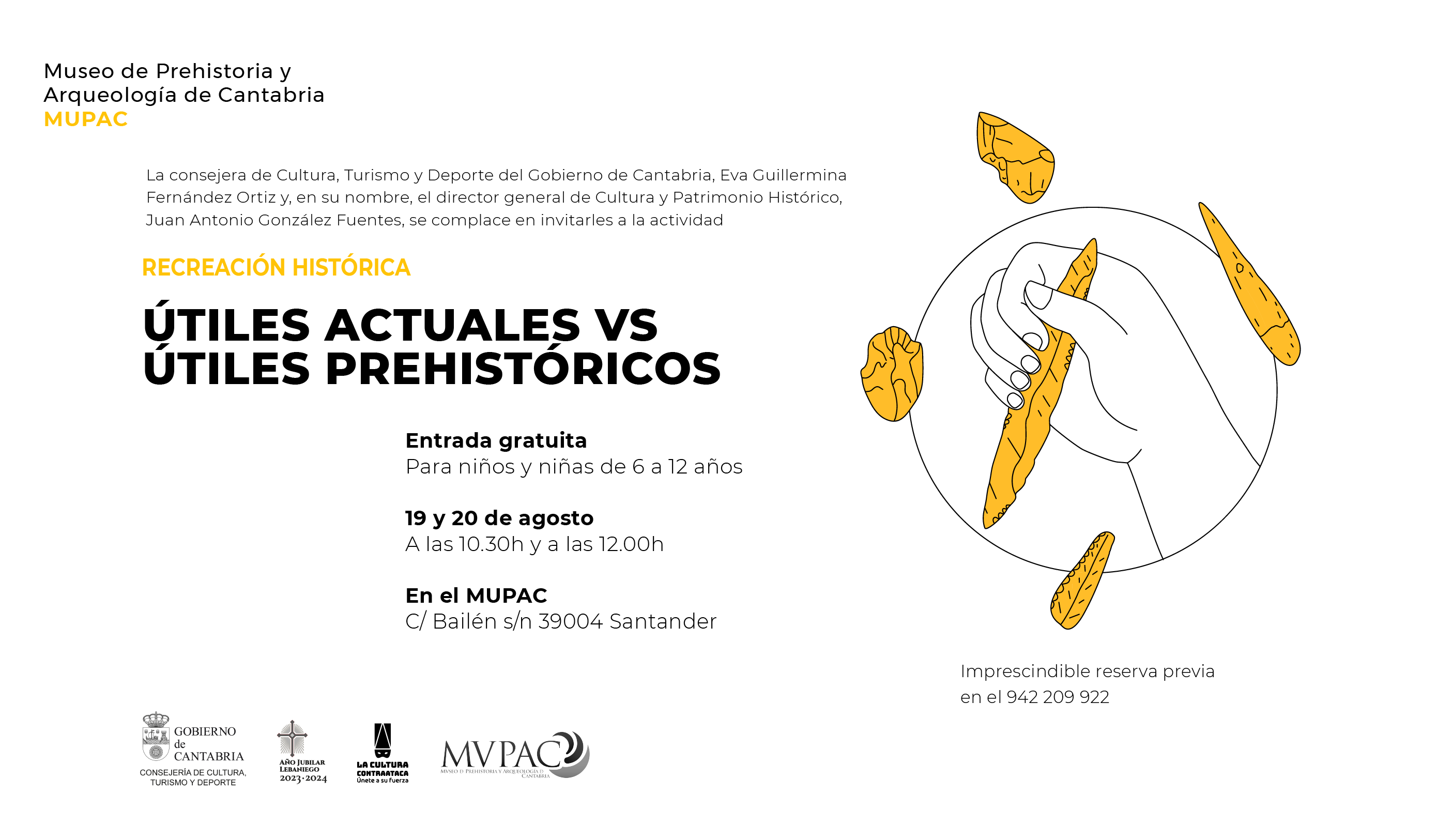 El Museo de Prehistoria y Arqueología de Cantabria (MUPAC) organiza la actividad didáctica "Útiles actuales vs útiles prehistóricos". Dirigido a niñas y niños de 6 a 12 años, el taller tendrá lugar los días 19 y 20 de agosto en dos sesiones, a las 10:30 y a las 12:00 h.