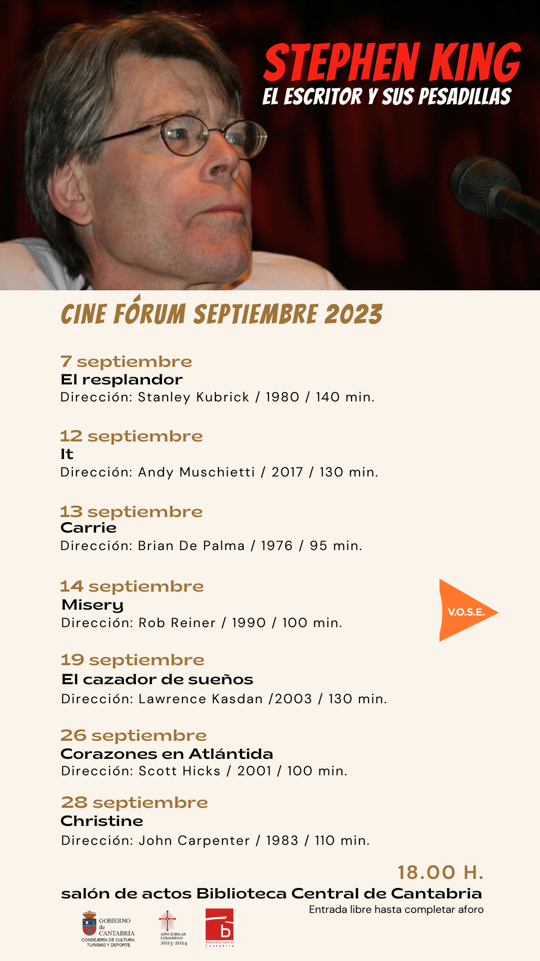 El ciclo de cine fórum de septiembre organizado por la Biblioteca Central de Cantabria reúne algunas de las películas basadas en las novelas de Stephen King más aclamadas por la crítica y los lectores.