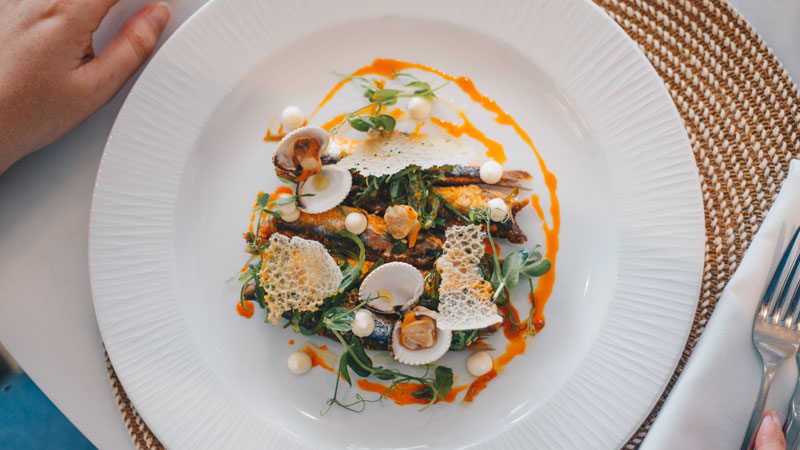 Bocartes fritos del Cantábrico con wakame y crujiente de coral