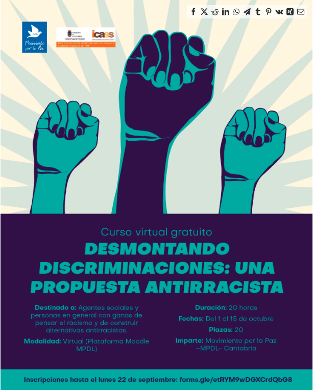 Movimiento por la Paz -MPDL- Cantabria lanza el curso virtual gratuito “Desmontando discriminaciones: una propuesta antirracista”. Se trata de una formación centrada en el tema del racismo, subrayando la necesidad de generar un compromiso antirracista.