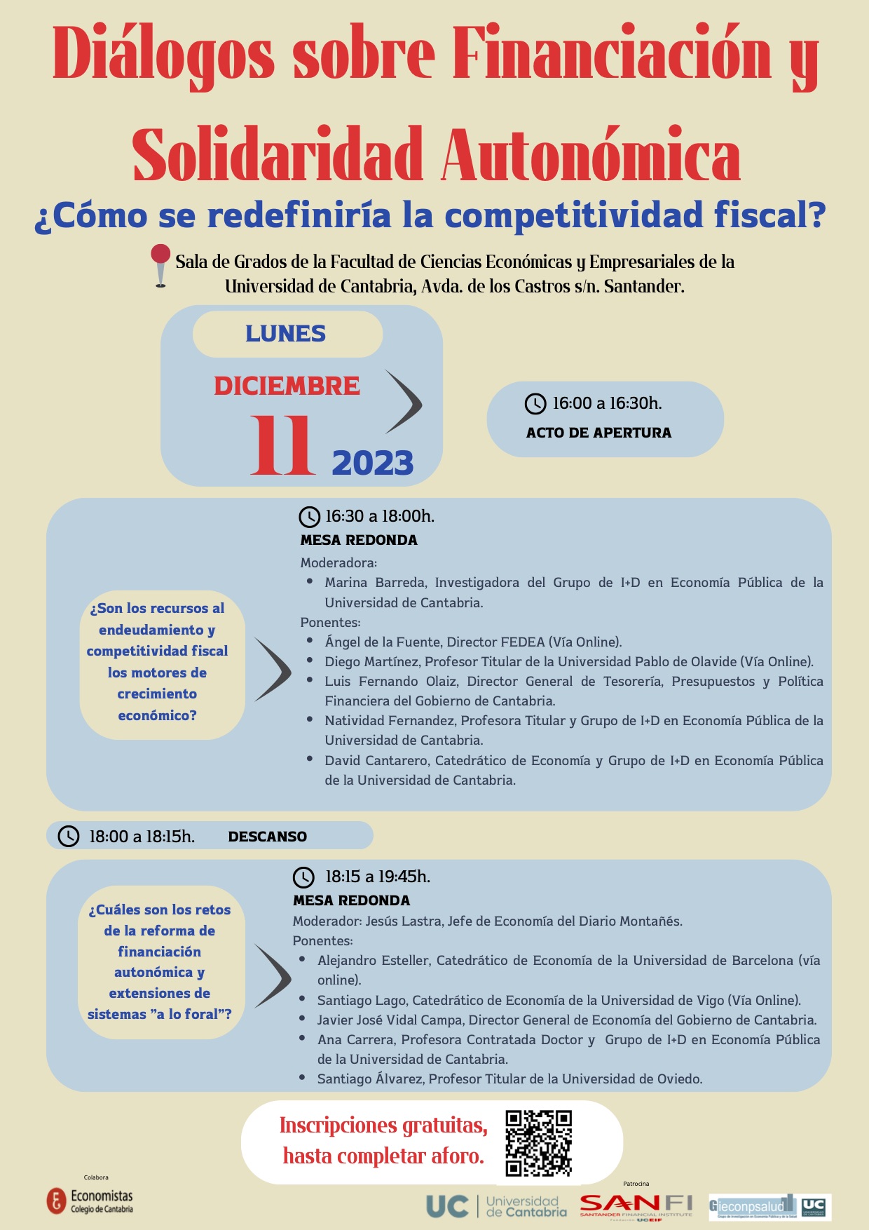 La Sala de Grados de la Facultad de Ciencias Económicas y Empresariales de la Universidad de Cantabria acoge, el lunes 11 de diciembre, la jornada “Diálogos sobre financiación y solidaridad autonómica. ¿Cómo se redefiniría la competitividad fiscal?”.