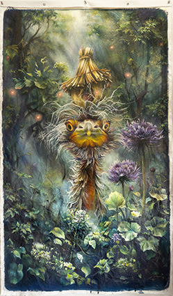 Sus pinturas recuerdan a ciertos bodegones barrocos, inquietantes, en los que nos presenta un mundo de animales y plantas exuberantes. Pinturas en las que la naturaleza estalla, se expresa, nos sobrecoge, nos produce un impacto visual fuerte por la fuerza de unas imágenes autónomas que se instalan y dialogan con nuestro universo imaginario.