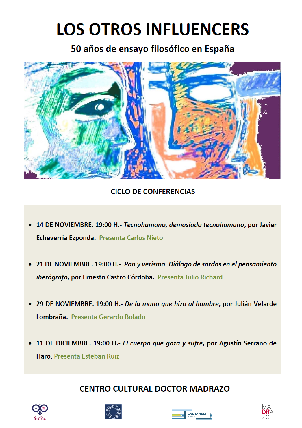 Los últimos 50 años de ensayo filosófico en España, y algunos de sus más destacados representantes generacionales, serán protagonistas en noviembre y diciembre de un programa compuesto por un ciclo de conferencias y una exposición gráfica, que tendrán lugar en el Centro Cultural Doctor Madrazo. Las actividades han sido organizadas por la Sociedad Cántabra de Historiadores de la Filosofía Española (SCHFE) con el apoyo de la Concejalía de Cultura del Ayuntamiento de Santander.