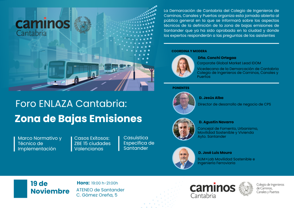 La Demarcación de Cantabria del Colegio de Ingenieros de Caminos, Canales y Puertos organiza un nuevo Foro ENLAZA Cantabria donde informará y dará a conocer a técnicos y sociedad en general los parámetros y condicionantes en la definición de la Zona de Bajas Emisiones de Santander que próximamente se implementarán en la ciudad.