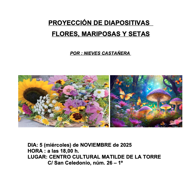 El miércoles 5 de noviembre de 2025, a las 18:00 horas, en el taller de actividades, tendrá lugar el encuentro con la profesora Nieves Castañera, quien hablará sobre “Flores, Mariposas y Setas”.