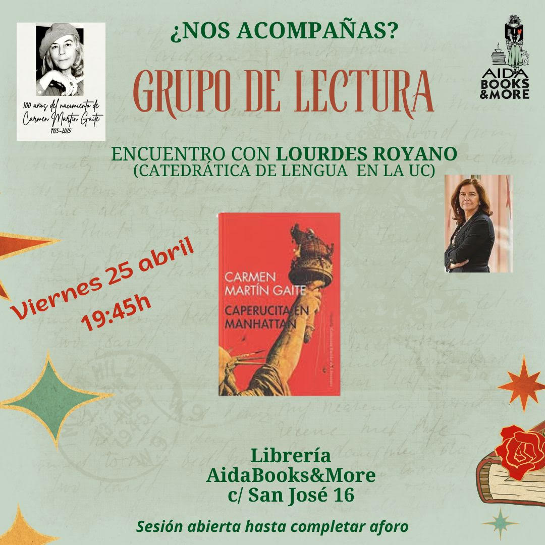 El grupo de lectura de Aida Books mantendrá un encuentro literario con Lourdes Royano, catedrática de Lengua Española de la Universidad de Cantabria (UC), para compartir la lectura del libro "Caperucita en Manhattan" de la autora Carmen Martín Gaite en el centenario de su nacimiento.