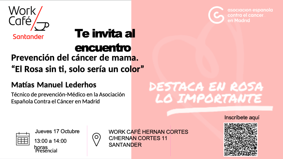 El Work Café Santander de Hernán Cortés ofrece la retransmisión, proyectada en el video wall, del encuentro sobre prevención del cáncer de mama "El rosa sin ti, solo sería un color", en el que intervendrá Matías Manuel Lederhos, técnico de prevención-médico en la Asociación Española contra el Cáncer Madrid.