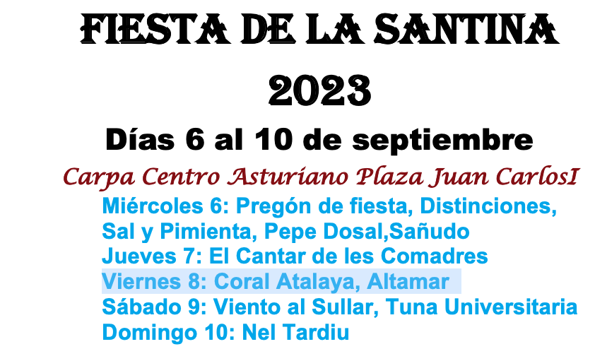 Ya el domingo 10, desde las 11:45 horas, tendrá lugar la procesión desde la sede del Centro Asturiano hasta la iglesia de las Reparadoras ( C/ Rubio), con la imagen de la “Santina”, acompañada por el Coro Ronda Altamira, Veteranos de la Armada, la Junta Directiva, Socios y la banda de Gaitas del Carmen. Además, la carpa acogerá la actuación de Nel Tardiu a las 20:30 h.