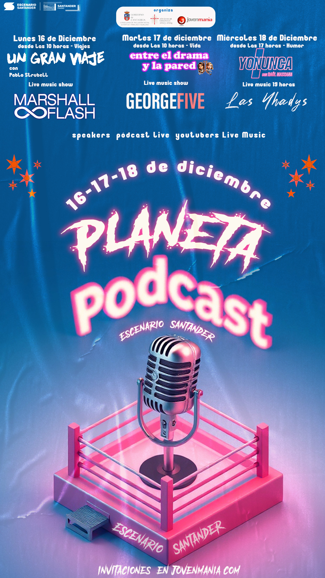 Planeta Podcast es el nombre del novedoso festival que acogerá a partir de este lunes Escenario Santander. Una iniciativa patrocinada por la Dirección General de Inclusión Social, Juventud, Familias e Igualdad, cuyo objetivo pasa por reunir a amantes del podcasting y explorar temas de actualidad a través de contenidos innovadores. El acceso será mediante invitación que se puede recoger en la web jovenmania.com