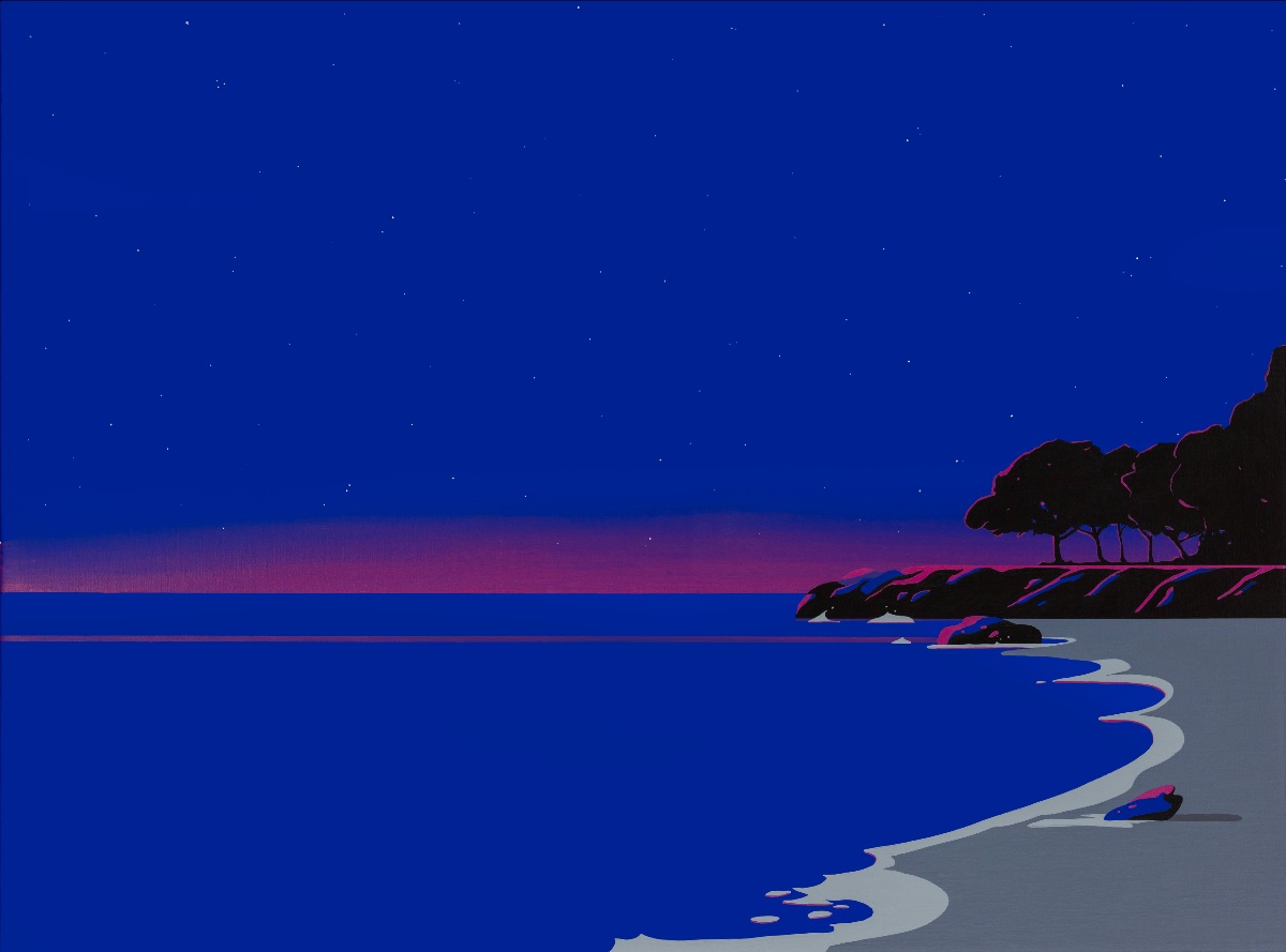 En este universo, que oscila entre lo real y lo surreal, la arquitectura aparece como si estuviera sobre un escenario, resaltada por un juego de luces casi teatral que Night light IV, 2025. Acrílico sobre tela. 60 x 81 cm. contrasta con el inmenso océano que domina las composiciones. Las formas geométricas de influencia del movimiento moderno dialogan con la vastedad natural, creando una delicada tensión que resalta la belleza efímera de ese momento.
