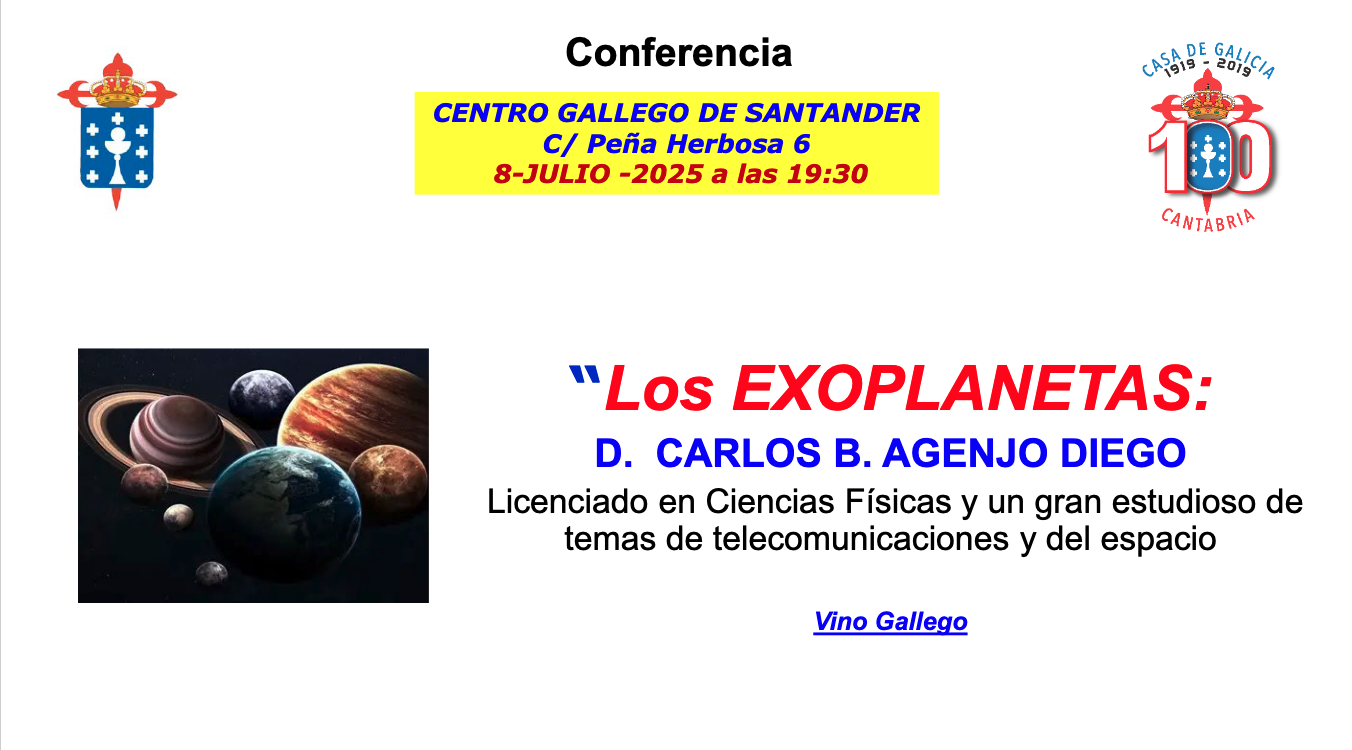 El Centro Gallego de Santander acoge la conferencia "Los exoplanetas", a cargo de Carlos B. Agenjo, licenciado en Ciencias Físicas y un gran estudioso de temas de telecomunicaciones y del espacio.