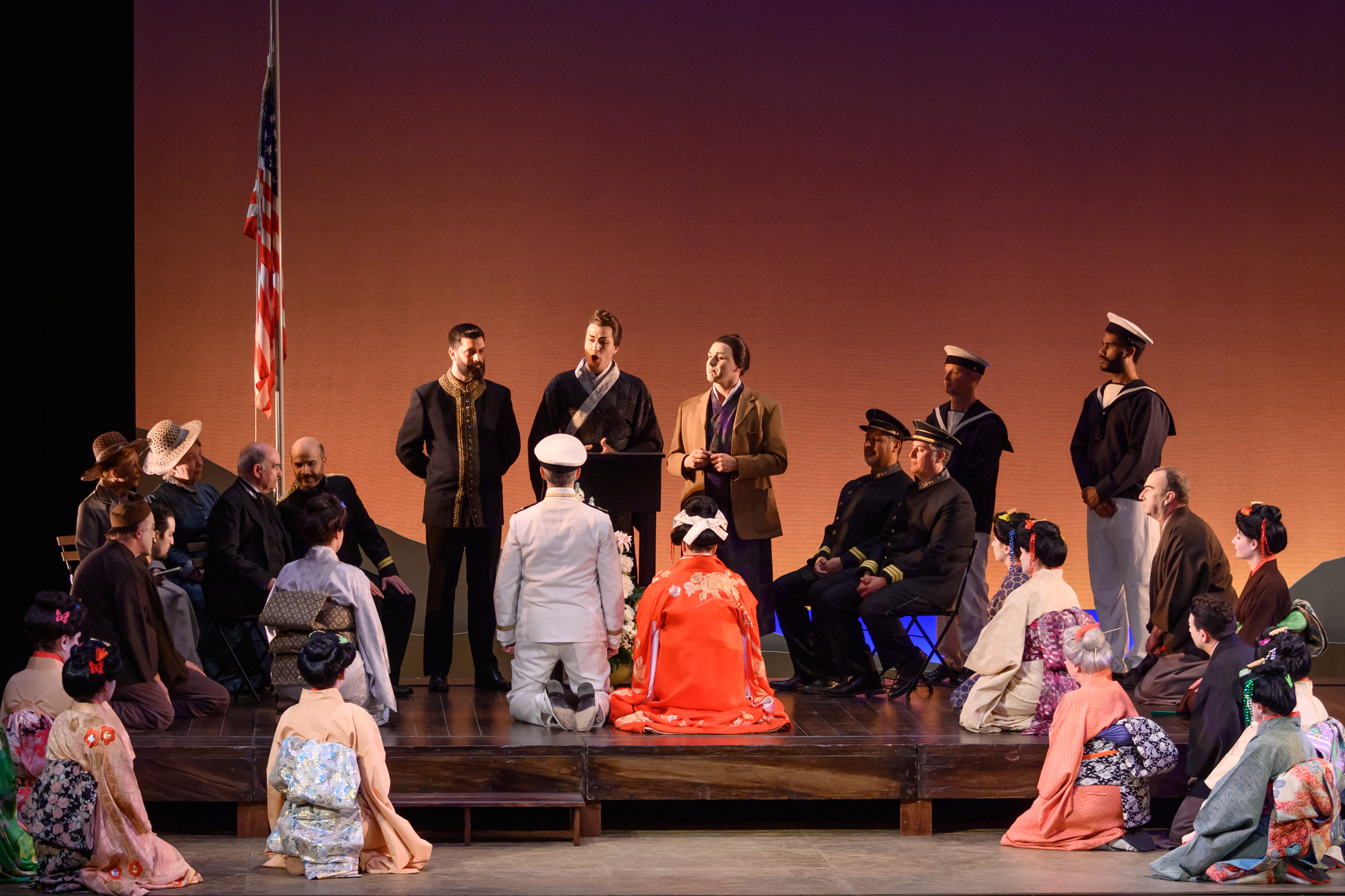 Llega el séquito de la novia, una numerosa comitiva de parientes y amigos (Quanto cielo! Quanto mar!). Con mucha ceremonia, Butterfly conversa con los dos americanos (Gran ventura). Cuando le preguntan la edad confiesa tener quince años. Su padre está muerto (Goro añade discretamente que fue por invitación del mikado, el emperador) y, como la situación de la familia es precaria, ella ha tenido que trabajar de geisha (E abbiam fatto la ghescia). Sus familiares y amigos hacen mucho ruido y Pinkerton observa todo muy divertido.