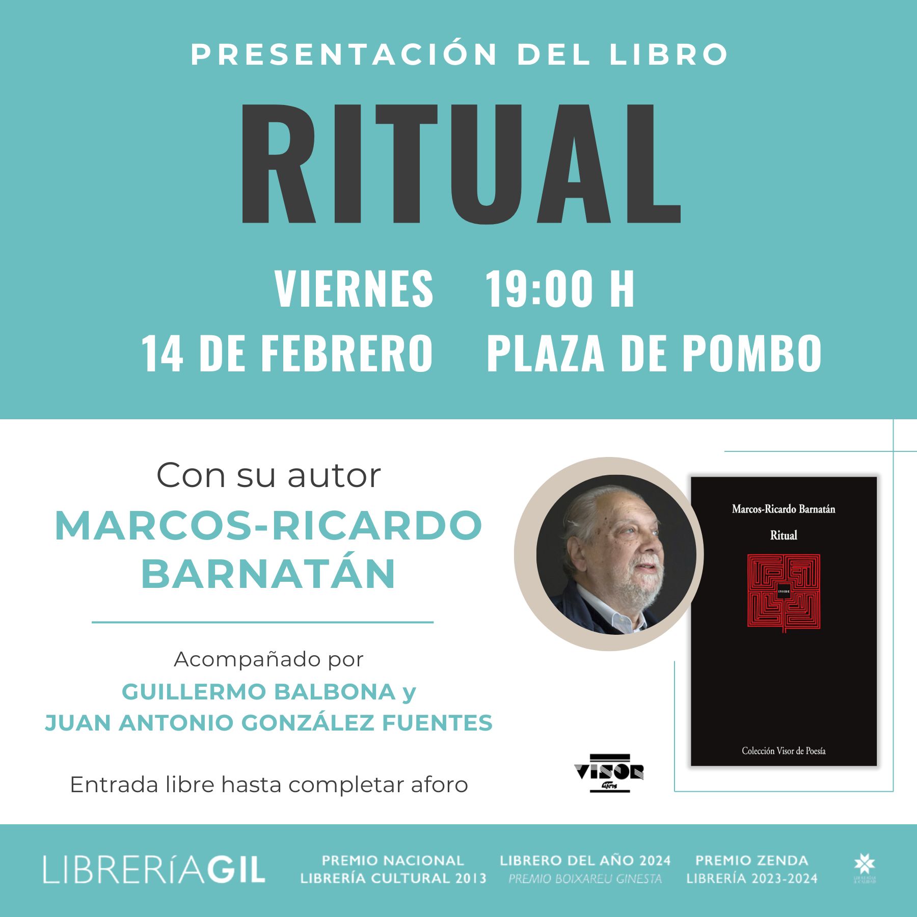 El viernes 14 de febrero, a las 19:00 h. Librería Gil acoge la presentación de “Ritual”, de Marcos-Ricardo Barnatán. El autor estará acompañado por Guillermo Balbona y Juan Antonio González Fuentes. (Visor Libros).