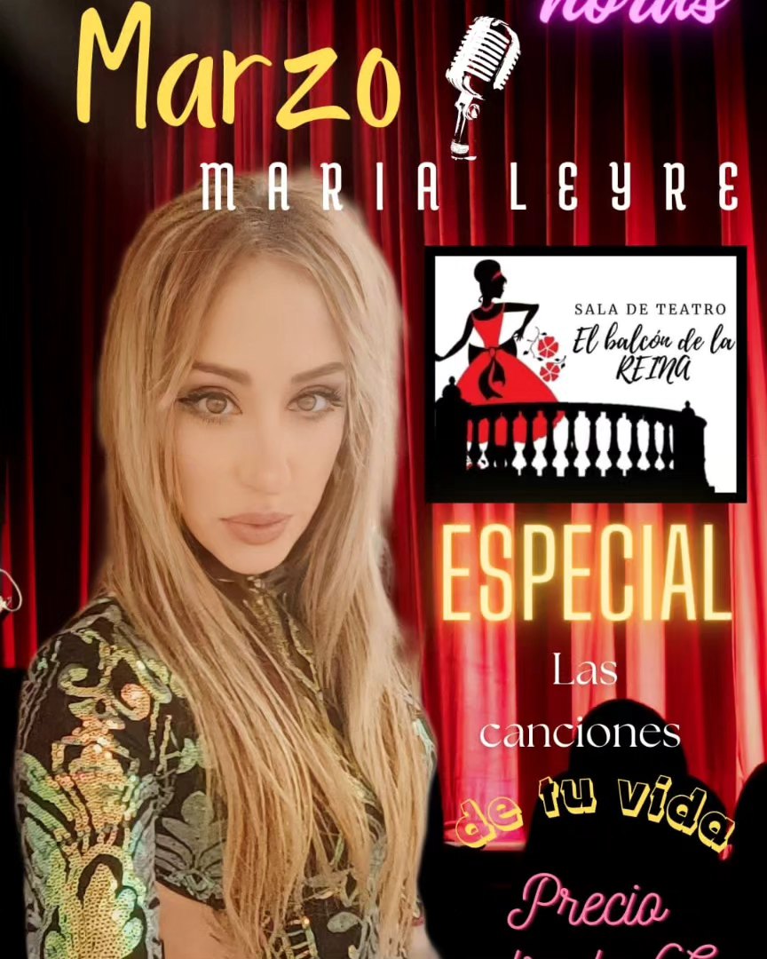 El viernes 1 de marzo a las 21:00h. la cantante María Leyre ofrecerá en El Balcón de la Reina (Espacio Cultural Be The Beat) su gran voz interpretando "Las canciones de tu vida".
