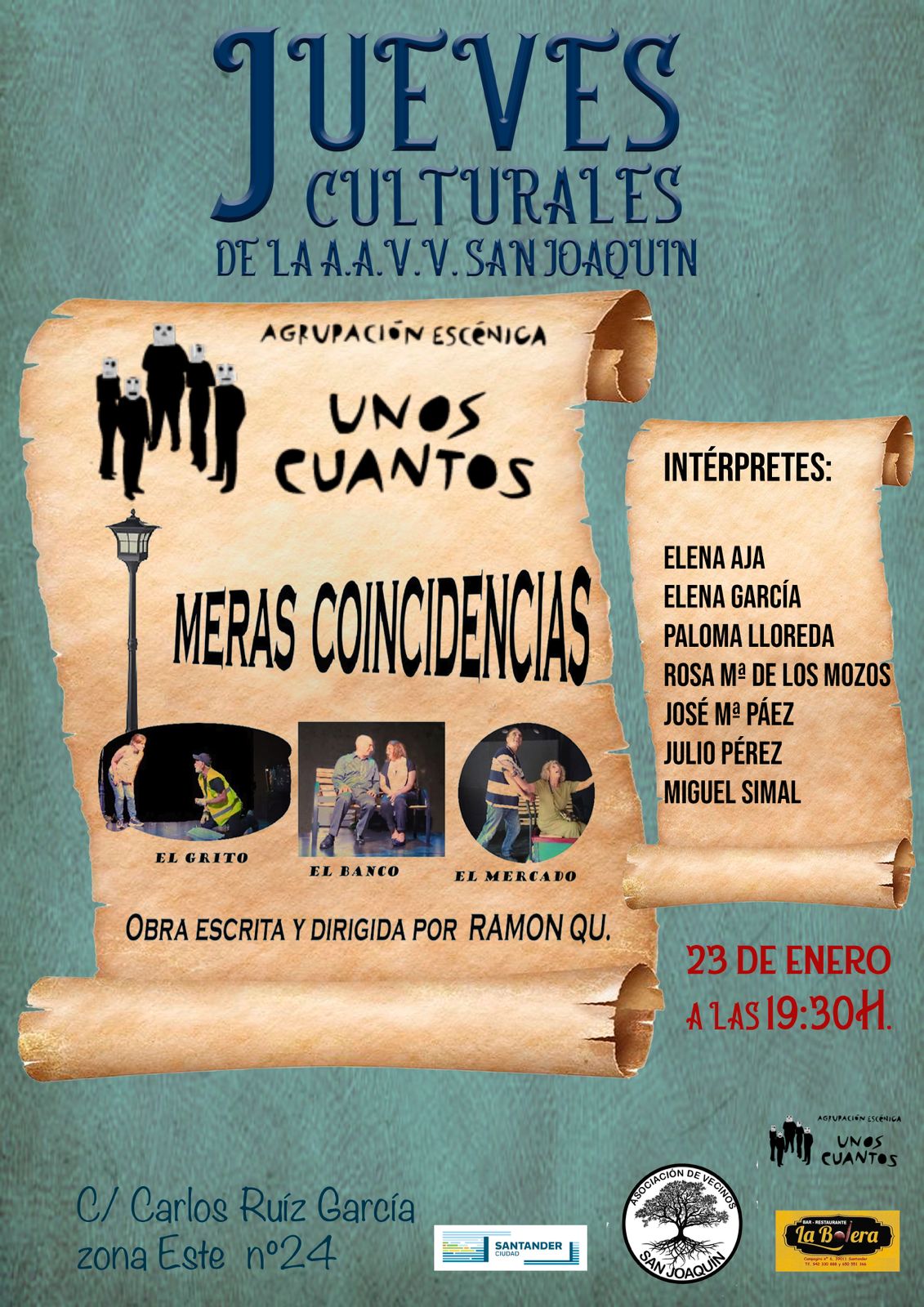 La Agrupación Escénica Unos Cuantos representa la obra “Meras Coincidencias”, a las 19,30 horas del próximo 23 de enero, en la AAVV de San Joaquín, sita en la calle Carlos Ruiz García, número 24, en Campogiro, Santander