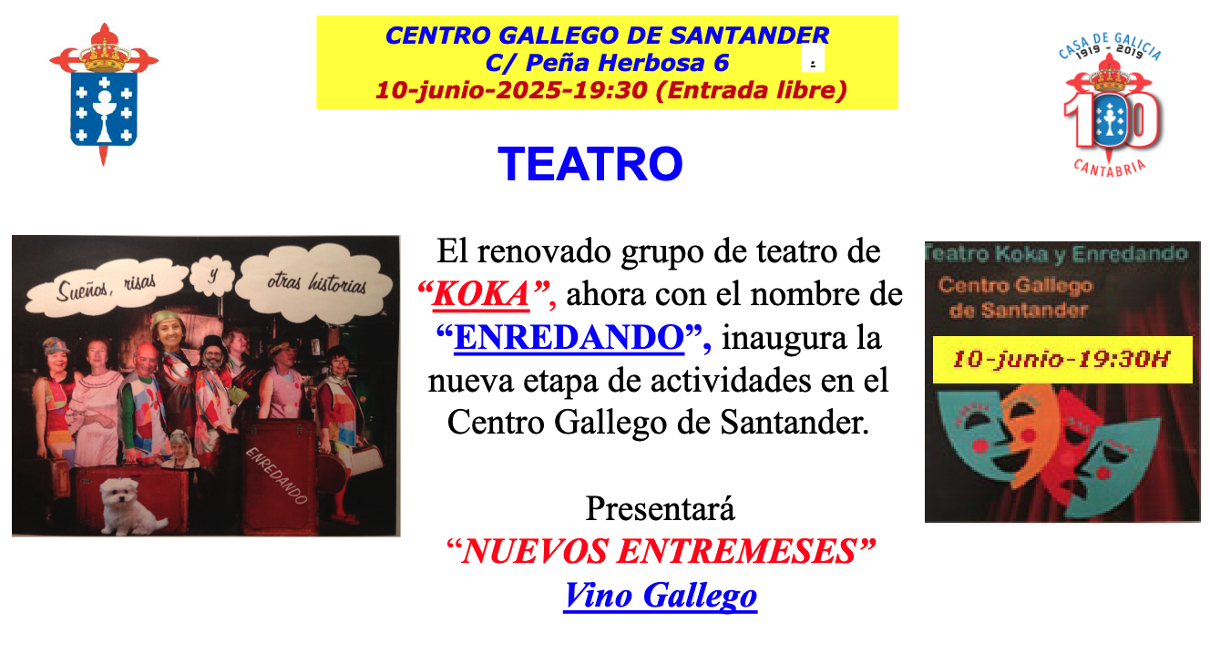 El martes 10 de junio el renovado grupo de teatro de Koka, ahora con el nombre de Enredando, inaugura una nueva etapa de actividades en el Centro Gallego de Santander. La cita, en la que presentará “Nuevos entremeses”, se celebrará a las 19:30h, con entrada libre hasta completar el aforo,
