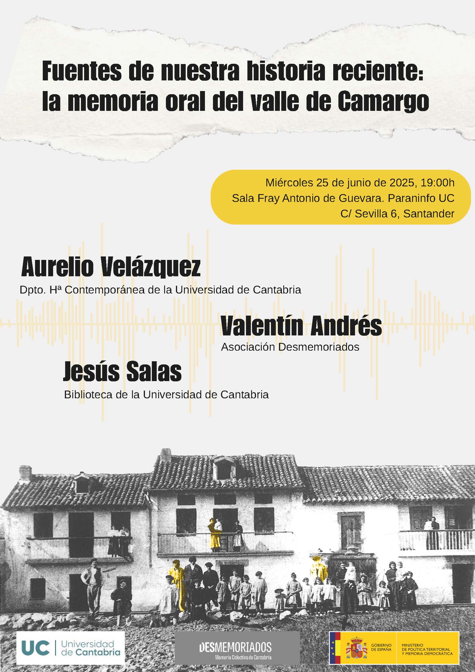 El proyecto de la “Memoria oral del valle de Camargo” que ahora se presenta es resultado de un esfuerzo colectivo para la conservación, digitalización y difusión de la herencia cultural. Se inició con la grabación en los años 90 de medio centenar de testimonios orales de vecinos del valle que rememoran aspectos de la vida cotidiana y los avatares políticos entre los años 1920 y 1960 y dieron lugar a publicar una investigación en 2002. Los registros se conservaron en cintas analógicas y recientemente se ha procedido a su catalogación, digitalización y puesta al servicio de la investigación, como fuentes de la historia contemporánea, en la Biblioteca de la Universidad. Una serie de clips seleccionados se difundirán además públicamente online a través de la plataforma UC ReCrea.