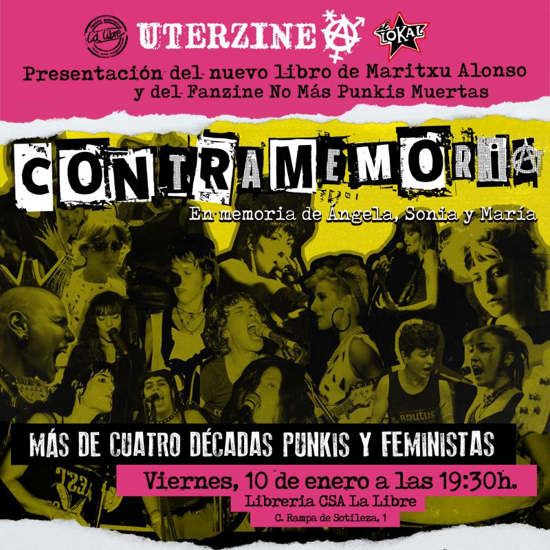 El viernes 10 de enero a partir de las 19:30h, Maritxu Alonso estará en La Libre presentando su último libro “Contramemoria. Más de cuatro décadas punkis y feministas”. Junto a él se presentará el fanzine realizado en el Rock Beer The New el 7 de diciembre de 2023, durante la jornada “No más punkis muertas”. Todo en Memoria de Ángela, Sonia y María.