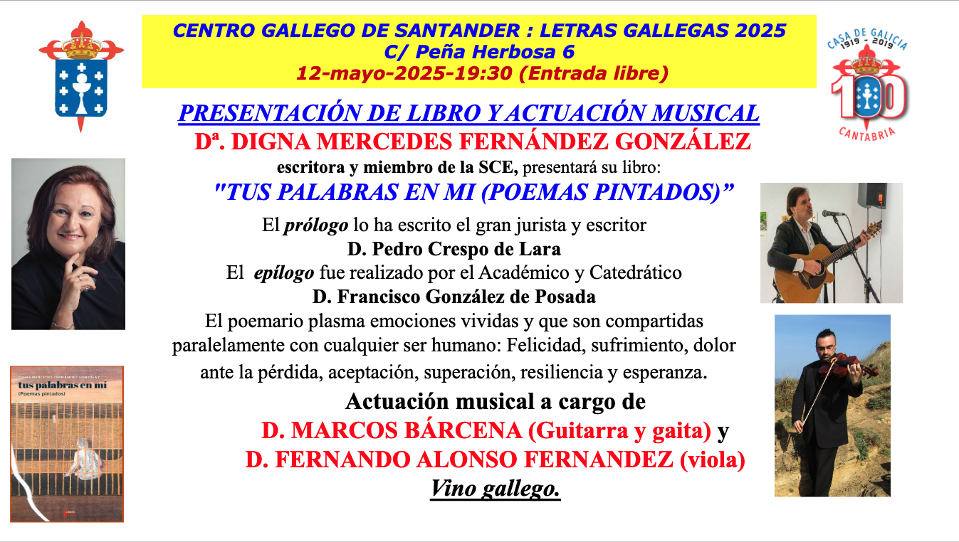 La escritora Digna Mercedes Fernández presentará en el Centro Gallego su libro "Tus palabras en mí (poemas pintados)", un poemario que plasma emociones vividas y que son compartidas paralelamente con cualquier ser humano: felicidad, sufrimiento, dolor ante la pérdida, aceptación, superación, resiliencia y esperanza. El prólogo ha sido escrito por el jurista y escritor Pedro Crespo de Lara y el epílogo fue realizado por el académico y catedrático Francisco González de Posada.