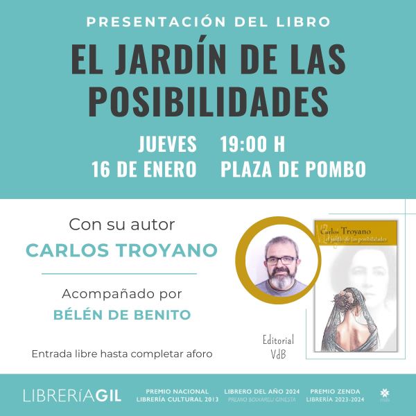 El jueves 16 de enero, a las 19:00 h. tendrá lugar la presentación del libro “El jardín de las posibilidades”, de Carlos Troyano. El autor estará acompañado por Belén de Benito (Editorial VdB).