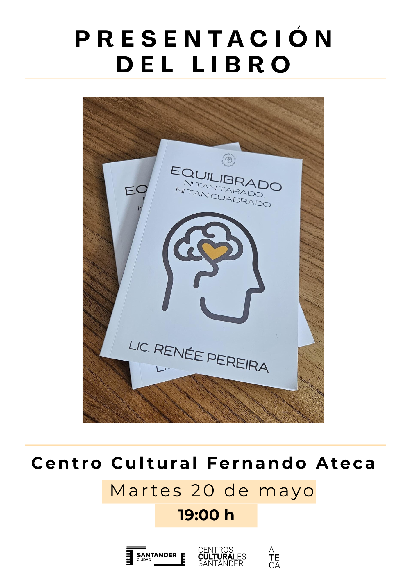 El martes 20 de mayo, a las 19:00 h, el Centro Cultural Fernando Ateca acoge la presentación del libro “Equilibrado. Ni tan tarado, ni tan cuadrado”, a cargo de su autor Renée Pereira.