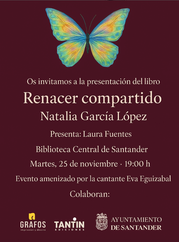La Librería Ediciones Tantín organiza la presentación del libro “Renacer compartido”, de Natalia García López el martes 25 de noviembre a las 19:00h en la Biblioteca Central de Cantabria. La autora será presentada por Laura Fuentes.